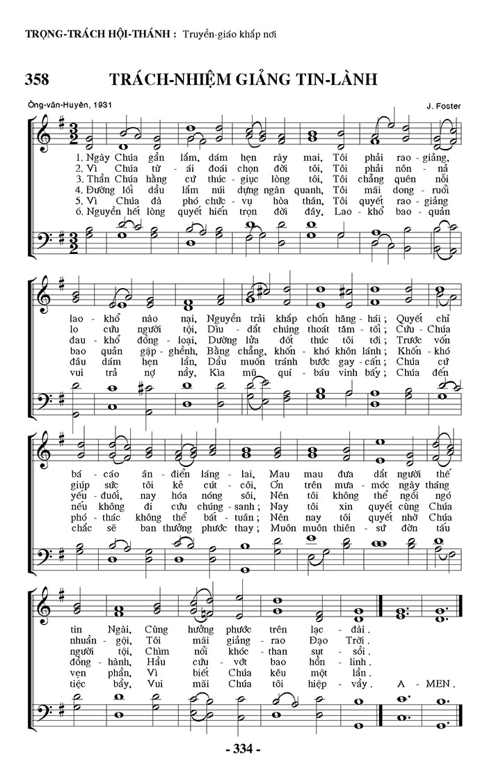 1. Ngày Chúa gần lắm, dám hẹn rày mai, Tôi phải rao giảng, lao khổ nào nại, Nguyễn trải khắp chốn hăng hái; Quyết chỉ bá cáo ân điển láng lai, Mau mau đưa dắt người thế tin Ngài, Cùng hưởng phước trên lạc đài. 2. Vì Chúa từ ái đoái chọn đời tôi, Tôi phải nôn nả lo cứu người tội, Dìu dắt chúng thoát tăm tối; Cứu Chúa giúp sức tôi kẻ cút côi, Ơn trên mưa móc ngày tháng nhuần gội, Tôi mãi giảng rao Đạo Trời. 3. Thần Chúa hằng cứ thúc giục lòng tôi, Tôi chẳng quên nỗi dau khổ đồng loại, Dường lửa đốt thúc tôi tới; Trước vốn yếu đuối, nay hóa nóng sôi, Nên tôi không thể ngồi ngó người tội, Chìm nổi khóc than sụt sồi. 4. Đường lối dầu lắm núi dựng ngàn quanh, Tôi mãi dong ruổi bao quản gập ghềnh, Bằng chẳng, khốn khó khôn lánh; Khốn khó nếu không đi cứu chúng sanh; Nay tôi xin quyết cùng Chúa đồng hành, Hầu cứu vớt bao hồn linh. 5. Vì Chúa đã phó chức vụ hòa thân, Tôi quyết rao giảng đâu dám hẹn lần, Dầu muốn tránh bước gay cấn; Chúa cứu phó thác không thể bất tuân; Nên nay tôi quyết nhờ Chúa vẹn phần, Vì biết Chúa kêu một lần. 6. Nguyễn hết lòng quyết hiến trọn đời đây, Lao khổ bao quản vui trả nợ nầy, Kìa mũ quí báu vinh bấy; Chúa đến chắc sẽ ban thưởng phước thay; Muôn muôn thiên sứ đờn tấu tiệc bầy, Vui mãi Chúa tôi hiệp vầy. Outro: A - MEN.