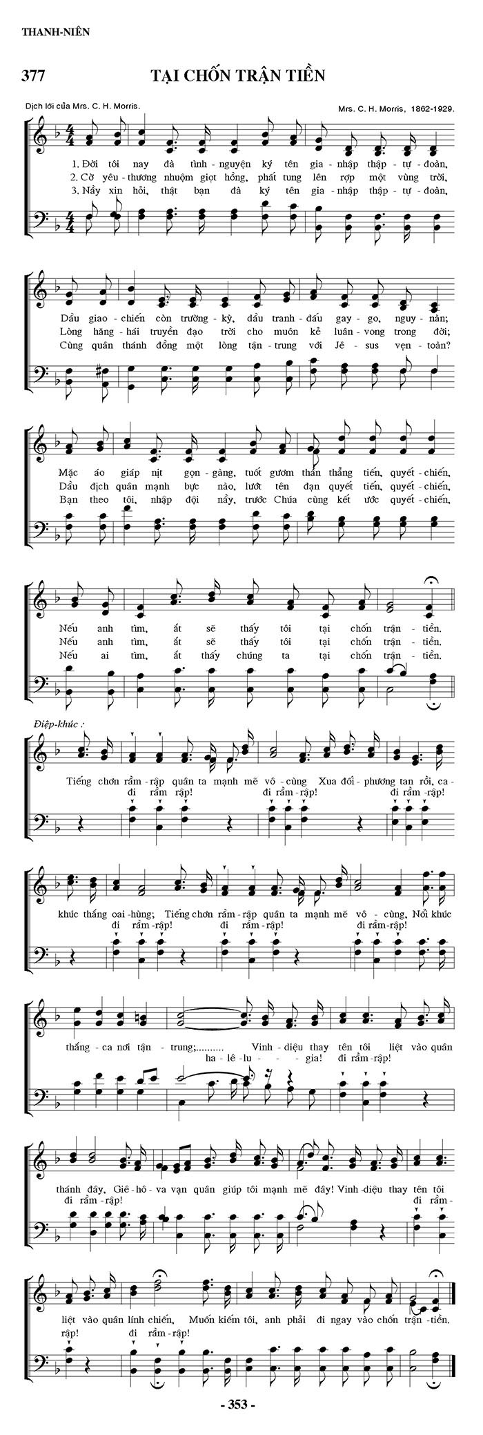 1. Đời tôi nay đà tình nguyện ký tên gia nhập thập tự đoàn, Dầu giao chiến còn trường kỳ, dầu tranh đấu gay go, nguy nân; Mặc áo giáp nịt gọn gàng, tuốt gươm thần thẳng tiến, quyết chiến, Nếu anh tìm, ắt sẽ thấy tôi tại chốn trận tiền. 2. Cờ yêu thương nhuộm giọt hồng, phất tung lên rợp một vùng trời, Lòng hăng hái truyền đạo trời cho muôn kẻ luân vong trong đời; Dầu địch quân mạnh bực nào, lướt tên đạn quyết tiến, quyết chiến, Nếu anh tìm, ắt sẽ thấy tôi tại chốn trận tiền. 3. Nầy xin hỏi, thật bạn đà ký tên gia nhập thập tự đoàn, Cùng quân thánh đồng một lòng tận trung với Jê-sus vẹn toàn? Bạn theo tôi, nhập đội nầy, trước Chúa cùng kết ước quyết chiến, Nếu ai tìm, ắt thấy chúng ta tại chốn trận tiền. 4. Tiếng chơn rầm rập quân ta mạnh mẽ vô cùng Xua đối phương tan rồi, ca đi rầm rập! khúc thắng oai hùng; Tiếng chơn rầm rập quân ta mạnh mẽ vô cùng, Nổi khúc đi rầm rập! thắng ca nơi tận trung; Vinh diệu thay tên tôi liệt vào quân đi rầm rập! thánh đây, Giê-hô-va vạn quân giúp tôi mạnh mẽ đây! Vinh diệu thay tên tôi đi rầm rập! liệt vào quân lính chiến, Muốn kiếm tôi, anh phải đi ngay vào chốn trận tiền, đi rầm rập! Điệp khúc: Tiếng chơn rầm rập quân ta mạnh mẽ vô cùng Xua đối phương tan rồi, ca đi rầm rập! khúc thắng oai hùng; Tiếng chơn rầm rập quân ta mạnh mẽ vô cùng, Nổi khúc đi rầm rập! thắng ca nơi tận trung; Vinh diệu thay tên tôi liệt vào quân đi rầm rập! thánh đây, Giê-hô-va vạn quân giúp tôi mạnh mẽ đây! Vinh diệu thay tên tôi đi rầm rập! liệt vào quân lính chiến, Muốn kiếm tôi, anh phải đi ngay vào chốn trận tiền, đi rầm rập!