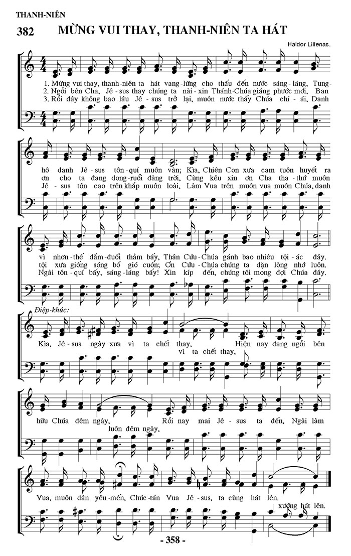 1. Mừng vui thay, thanh niên ta hát vang lừng cho thấu đến nước sáng-láng, Tung hô danh Jêsus tôn-quí muôn vàn; Kìa, Chiên Con xưa cam tuôn huyết ra vì nhơn-thế đắm-đuối thảm bấy, Thân Cứu Chúa gánh bao nhiêu tội-ác đây. 2. Ngồi bên Cha, Jêsus thay chúng ta nài-xin Thánh Chúa giáng phước mới, Ban ơn cho ta đang dong-ruổi đàng trời, Cùng kêu xin ơn Cha tha-thứ muốn tội xưa giống sóng bổ gió cuốn; Ơn Cứu-Chúa chúng ta dặn lòng nhớ luôn. 3. Rồi đây không bao lâu Jêsus trở lại, muốn nước thấy Chúa chí-ái, Danh Jêsus tôn cao trên khắp muôn loài, Làm Vua trên muôn vua muôn Chúa, danh Ngài tôn-quí bấy, sáng-láng bấy! Xin kíp đến, chúng tôi mong đợi Chúa đây. Điệp khúc: Kìa, Jêsus ngày xưa vì ta chết thay, Hiện nay đang ngồi bên hữu Chúa đêm ngày, Rồi nay mai Jêsus ta đến, Ngài làm Vua, muôn dân yêu-mến, Chúc tán Vua Jêsus, ta cùng hát lên. luôn đêm ngày, vì ta chết thay, xướng hát lên.