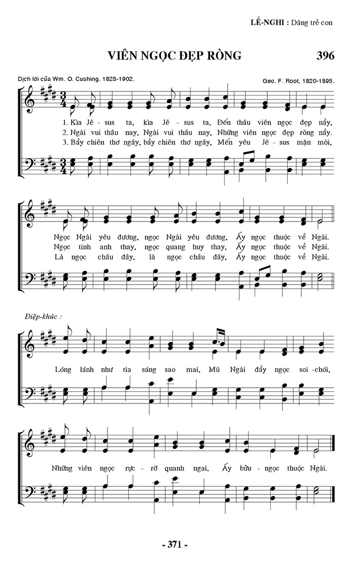 1. Kìa Jê-sus ta, kìa Jê-sus ta, Đến thâu viên ngọc đẹp nầy, Ngọc Ngài yêu đương, ngọc Ngài yêu đương, Ấy ngọc thuộc về Ngài. 2. Ngài vui thâu nay, Ngài vui thâu nay, Những viên ngọc đẹp ròng nầy. Ngọc tinh anh thay, ngọc quang huy thay, Ấy ngọc thuộc về Ngài. 3. Bầy chiên thơ ngây, bầy chiên thơ ngây, Mến yêu Jê-sus mặn mòi, Là ngọc châu đây, là ngọc châu đây, Ấy ngọc thuộc về Ngài. Điệp khúc: Lóng lánh như tia sáng sao mai, Mũ Ngài đầy ngọc soi chói, Những viên ngọc rực rỡ quanh ngai, Ấy bửu ngọc thuộc Ngài.