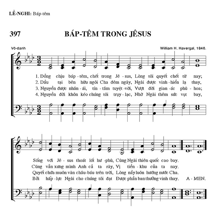 1. Đồng chịu báp-têm, chết trong Jê-sus, Lòng tôi quyết chết từ nay; Sống với Jê-sus thoát lốt hư-phù, Cùng Ngài thiên-quốc cao bay. 2. Dầu tại bên hữu ngôi Cha đêm ngày, Ngài được vinh-hiển lạ thay, Cũng vẫn xưng mình Anh cả ta rày, Vị tiền-khu của ta nay. 3. Nguyện được nhân-ái, tín-tâm tuyệt-vời, Vượt đời gian-ác phù-hoa; Quyết chứa muôn vàn châu-báu trên trời, Lòng nầy luôn hướng nước Cha. 4. Nguyện đời khôn kéo chúng tôi trụy-lạc, Nhờ Ngài thêm sức vụt bay, Bởi hấp-lực Ngài cho chúng tôi đạt Được phần ban thưởng vinh thay. A - MEN.