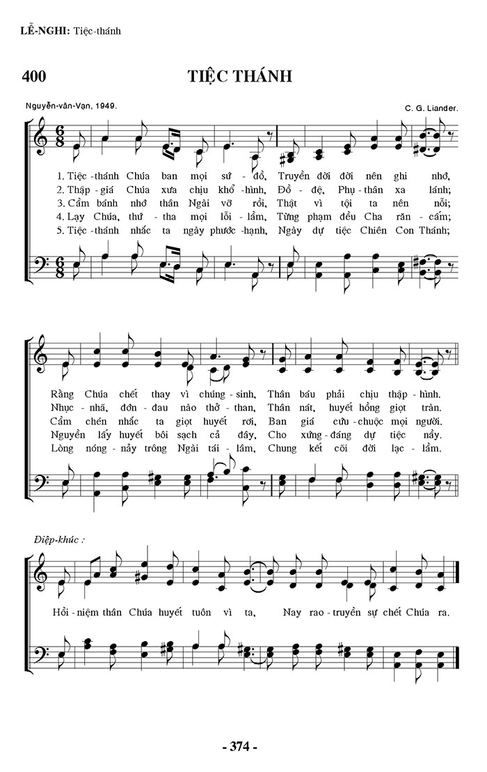 1. Tiệc -thánh Chúa ban mọi sứ đồ, Truyền đời đời nên ghi nhớ, Rằng Chúa chết thay vì chúng - sinh, Thân báu phải chịu thập - hình. Cầm chén nhắc ta giọt huyết rơi, Ban giá cứu - chuộc mọi người. Lòng nóng - nảy trông Ngài tái - lâm, Chung kết cõi đời lạc - lầm. 2. Thập - giá Chúa xưa chịu khổ - hình, Đồ - đệ, Phụ - thân xa lánh; Nhục - nhã, đớn - đau nào thở - than, Thân nát, huyết hồng giọt tràn. Nguyễn lấy huyết bôi sạch cả đây, Cho xứng - đáng dự tiệc nầy. 3. Cầm bánh nhớ thân Ngài vỡ rồi, Thật vì tội ta nên nỗi; Cầm chén nhắc ta giọt huyết rơi, Ban giá cứu - chuộc mọi người. Lòng nóng - nảy trông Ngài tái - lâm, Chung kết cõi đời lạc - lầm. 4. Lạy Chúa, thứ - tha mọi lỗi - lầm, Từng phạm đều Cha răn - cấm; Nhục - nhã, đớn - đau nào thở - than, Thân nát, huyết hồng giọt tràn. Nguyễn lấy huyết bôi sạch cả đây, Cho xứng - đáng dự tiệc nầy. 5. Tiệc -thánh nhắc ta ngày phước -hạnh, Ngày dự tiệc Chiên Con Thánh; Rằng Chúa chết thay vì chúng - sinh, Thân báu phải chịu thập - hình. Cầm chén nhắc ta giọt huyết rơi, Ban giá cứu - chuộc mọi người. Lòng nóng - nảy trông Ngài tái - lâm, Chung kết cõi đời lạc - lầm. Điệp khúc: Hồi - niệm thân Chúa huyết tuôn vì ta, Nay rao - truyền sự chết Chúa ra.