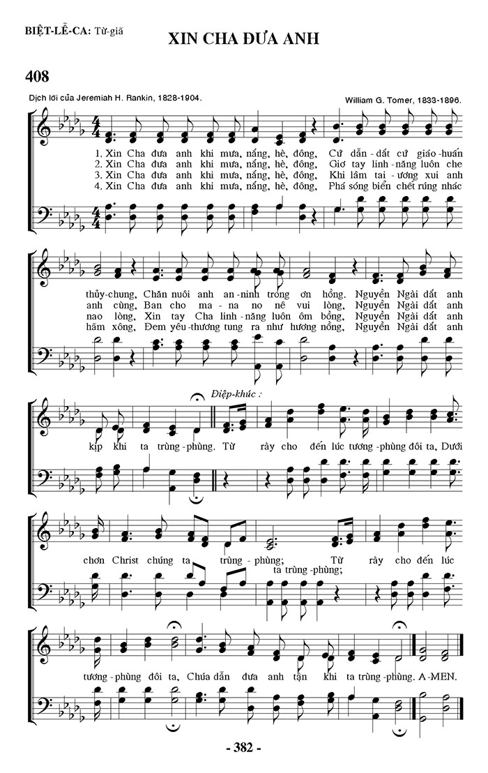 1. Xin Cha đưa anh khi mưa, nắng, hè, đông, Cứ dẫn dắt cử giáo huấn thủy chung, Chăn nuôi anh an-ninh trong ơn hồng. Nguyễn Ngài dắt anh 2. Xin Cha đưa anh khi mưa, nắng, hè, đông, Giơ tay linh năng luôn che anh cùng, Ban cho ma na no nê vui lòng, Nguyễn Ngài dắt anh 3. Xin Cha đưa anh khi mưa, nắng, hè, đông, Khi lâm tai ương xui anh nao lòng, Xin tay Cha linh năng luôn ôm bồng. Nguyễn Ngài dắt anh 4. Xin Cha đưa anh khi mưa, nắng, hè, đông, Phá sóng biển chết rúng nhác hãm xông, Đem yêu thương tung ra như hương nồng, Nguyễn Ngài dắt anh Điệp khúc: kịp khi ta trùng phùng. Từ rày cho đến lúc tương phùng đôi ta, Dưới chơn Christ chúng ta trùng phùng; Từ rày cho đến lúc ta trùng phùng; tương phùng đôi ta, Chúa dẫn đưa anh tận khi ta trùng phùng. A-MEN.