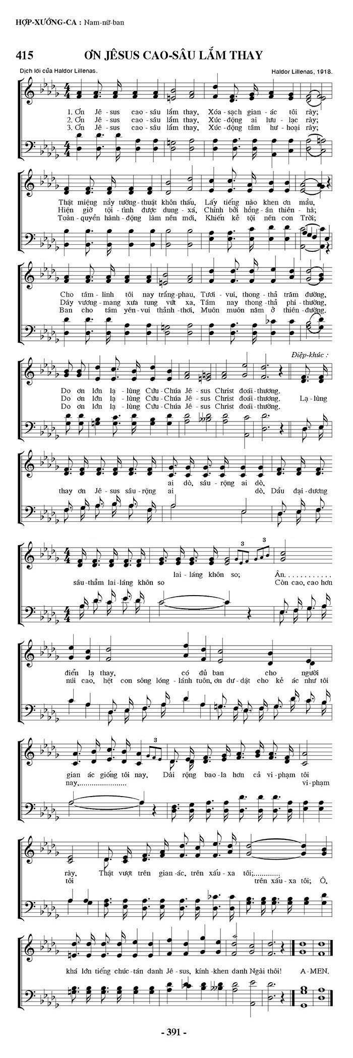 1. Ơn Jêsus cao sâu lắm thay, Xóa sạch gian ác tôi rày; Thật miệng nầy tường - thuật khôn thấu, Lấy tiếng nào khen ơn mầu, Cho tâm linh tôi nay trắng phau, Tươi vui, thong thả trăm đường, 2. Ơn Jê-sus cao sâu lắm thay, Xúc động ai lưu lạc rày; Hiện giờ tội tình được dung xá, Chính bởi hồng - ân thiên hà: Dây vương - mang xưa tung vứt xa, Tâm nay thong thả phi thường, 3. Ơn Jê-sus cao sâu lắm thay, Xúc động tâm hư hoại rày; Toàn - quyền hành - động làm nên mới, Khiến kẻ tội nên con Trời; Ban cho tâm yên vui thảnh thơi, Muôn muôn năm ở thiên đường. Điệp khúc: Do ơn lớn lạ lùng Cứu - Chúa Jê sus Christ đoái - thương. Lạ - lùng thay ơn Jê-sus sâu rộng ai dò, sâu rộng ai dò, ai dò, Dầu đại - dương sâu thẳm lai - láng khôn so; Ân. Còn cao, cao hơn điển lạ thay, có đủ ban cho người núi cao, hệt con sông lóng lánh tuôn, ơn dư dật cho kẻ ác như tôi gian ác giống tôi nay, Dài rộng bao la hơn cả vi phạm tôi vi-phạm rày, Thật vượt trên gian ác, trên xấu xa tôi;.............. trên xấu - xa tôi; Ô, khá lớn tiếng chúc tán danh Jêsus, kính-khen danh Ngài thôi! A-MEN.