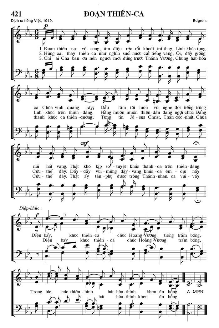 1. Đoạn thiên - ca vô song, âm điệu réo rất khoái trá thay, Linh khúc tụng- ca Chúa vinh - quang rày; Dầu tâm tôi luôn vui nghe đôi tiếng trũng núi hát vang. Thật khó kịp so tuyệt khúc thánh ca trên thiên đàng. 2. Hùng oai thay thiên ca như nghìn suối nước cất tiếng vang, Ôi, đấy giống linh - khúc trên thiên đàng, Hằng muôn muốn thiên dân đang ngợi chúc Đấng Cứu - thế đây, Đầy dẫy vui - mừng dậy vang khúc ca êm dịu nầy. 3. Chỉ ai Cha ban ơn nên người mới đứng trước Thánh Vương, Chung hát - hòa thanh khúc ca thiên đường; Từng tin Jêsus Christ, Thần độc nhứt, Chúa Cứu - thế đây, Thật ấy tân - phụ được trông Thánh-nhan, ca vui vầy. 4. Diệu bấy, khúc thiên ca chúc Hoàng Vương, tiếng trầm bổng, Trong lúc các thiên binh hát hòa-thinh khen ân hồng. A-MEN. Điệp khúc: Diệu bấy, khúc thiên ca chúc Hoàng Vương, tiếng trầm bổng, Trong lúc các thiên binh hát hòa-thinh khen ân hồng. A-MEN.