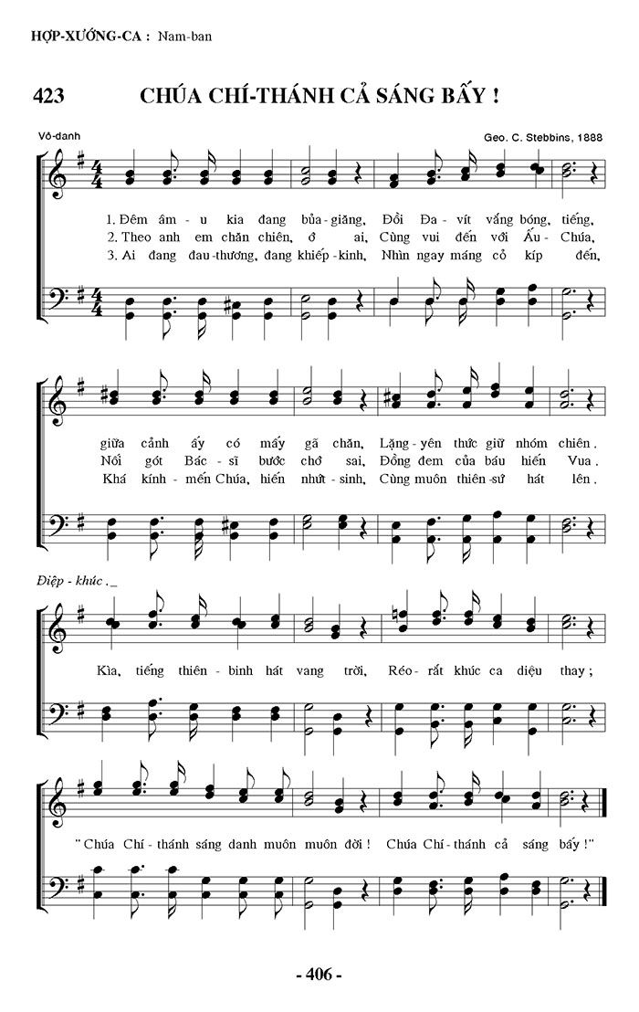 1. Đêm âm u kia đang bủa giăng, Đồi Đa-vít vắng bóng, tiếng, giữa cảnh ấy có mấy gã chăn, Lặng-yên thức giữ nhóm chiên. 2. Theo anh em chăn chiên, ở ai, Cùng vui đến với Ấu-Chúa, Nối gót Bác-sĩ bước chơ sai, Đồng đem của báu hiến Vua. 3. Ai đang đau thương, đang khiếp-kinh, Nhìn ngay máng cỏ kíp đến, Khá kính-mến Chúa, hiến nhứt-sinh, Cùng muôn thiên sứ hát lên. 4. Kìa, tiếng thiên-binh hát vang trời, Réo-rắt khúc ca diệu thay; Điệp khúc: "Chúa Chí-thánh sáng danh muôn muôn đời! Chúa Chí-thánh cả sáng bấy!"