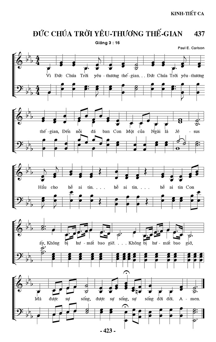 1. Vì Đức Chúa Trời yêu - thương thế - gian... Đức Chúa Trời yêu - thương thế - gian, Đến nỗi đã ban Con Một của Ngài là Jê - sus Hầu cho hễ ai tin... hễ ai tin... hễ ai tin Con ấy, Không bị hư - mất bao giờ... Không bị hư - mất bao giờ, Mà được sự sống, được sự sống, sự sống đời đời. A - men.