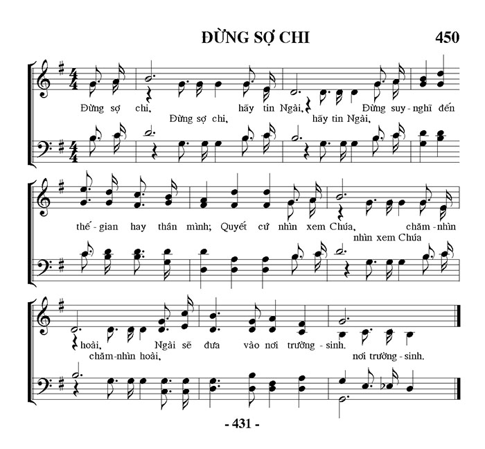 1. Đừng sợ chi, hãy tin Ngài, Đừng suy nghĩ đến thế gian hay thân mình; Quyết cứ nhìn xem Chúa, chăm nhìn hoài, Ngài sẽ đưa vào nơi trường sinh. 2. Đừng sợ chi, hãy tin Ngài, Đừng suy nghĩ đến thế gian hay thân mình; Quyết cứ nhìn xem Chúa, nhìn xem Chúa, Ngài sẽ đưa vào nơi trường sinh. 3. Đừng sợ chi, hãy tin Ngài, Đừng suy nghĩ đến thế gian hay thân mình; Quyết cứ nhìn xem Chúa, chăm nhìn hoài, nơi trường sinh.
