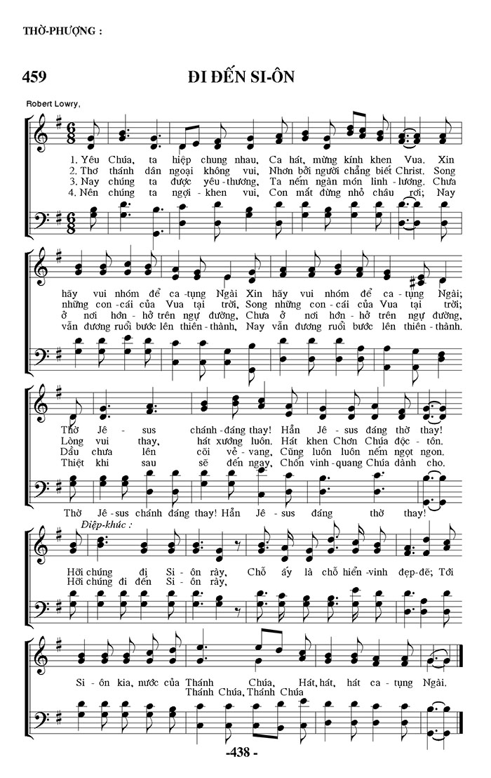 1. Yêu Chúa, ta hiệp chung nhau, Ca hát, mừng kính khen Vua. Xin hãy vui nhóm để ca tụng Ngài Xin hãy vui nhóm để ca tụng Ngài; Thờ Jê-sus chánh đáng thay! Hẳn Jê-sus đáng thờ thay! Lòng vui thay, hát xướng luôn. Hát khen Chơn Chúa độc tôn. Dầu chưa lên cõi vẻ vang, Cũng luôn luôn nếm ngọt ngon. Thiệt khi sau sẽ đến ngay, Chốn vinh-quang Chúa dành cho. 2. Thơ thánh dân ngoại không vui, Nhơn bởi người chẳng biết Christ. Song những con cái của Vua tại trời, Song những con cái của Vua tại trời; Thờ Jê-sus chánh đáng thay! Hẳn Jê-sus đáng thờ thay! Lòng vui thay, hát xướng luôn. Hát khen Chơn Chúa độc tôn. Dầu chưa lên cõi vẻ vang, Cũng luôn luôn nếm ngọt ngon. Thiệt khi sau sẽ đến ngay, Chốn vinh-quang Chúa dành cho. 3. Nay chúng ta được yêu-thương, Ta nếm ngàn món linh-lương. Chưa ở nơi hớn hở trên ngự đường, Chưa ở nơi hớn hở trên ngự đường; Thờ Jê-sus chánh đáng thay! Hẳn Jê-sus đáng thờ thay! Lòng vui thay, hát xướng luôn. Hát khen Chơn Chúa độc tôn. Dầu chưa lên cõi vẻ vang, Cũng luôn luôn nếm ngọt ngon. Thiệt khi sau sẽ đến ngay, Chốn vinh-quang Chúa dành cho. 4. Nên chúng ta ngợi khen vui, Con mắt đừng nhỏ châu rơi; Nay vẫn đương ruổi bước lên thiên-thành, Nay vẫn đương ruổi bước lên thiên-thành. Thờ Jê-sus chánh đáng thay! Hẳn Jê-sus đáng thờ thay! Lòng vui thay, hát xướng luôn. Hát khen Chơn Chúa độc tôn. Dầu chưa lên cõi vẻ vang, Cũng luôn luôn nếm ngọt ngon. Thiệt khi sau sẽ đến ngay, Chốn vinh-quang Chúa dành cho. Điệp khúc: Hởi chúng đi Si-ôn rày, Chỗ ấy là chỗ hiển vinh đẹp đẽ; Tới Hởi chúng đi đến Si-ôn rày, Si-ôn kia, nước của Thánh Chúa, Hát, hát, hát ca tụng Ngài. Thánh Chúa, Thánh Chúa