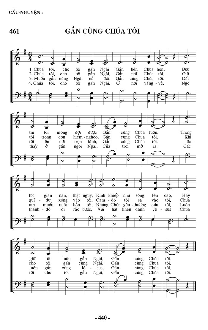 1. Chúa tôi, cho tôi gần Ngài Gần bên Chúa hơn; tin tôi mong đợi được Gần cùng Chúa luôn. lúc gian nan, thật nguy, Kinh-khiếp như sóng lên cao, giữ tôi luôn gần Ngài, Gần cùng Chúa tôi. 2. Chúa tôi, cho tôi gần Ngài, Gần nơi Chúa tôi. tôi trong cơn hiểm - nghèo, Gần cùng Chúa tôi. qui dữ xông vào tôi, Cám dỗ tôi sa vào tội, cho tôi gần cùng Ngài, Gần cùng Chúa tôi. 3. Muốn gần cùng Ngài cả đời, Gần cùng Chúa tôi. tôi lên nơi trọn lành, Gần cùng Chúa tôi. tan muốn nuốt hồn tôi, Nhưng Chúa yêu - thương cứu tôi, luôn gần cùng Jê sus, Gần cùng Chúa tôi. 4. Chúa tôi, cho tôi gần Ngài, Ở nơi vắng vẻ, thấy Ở gần ngôi Ngài, Cửa trời mở ra. thánh - đồ đi rảo bước, Vui hát khen danh Jê - sus Chúa tôi cho tôi gần Ngài, Gần cùng Chúa tôi.