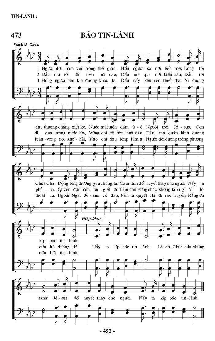 1. Người đời ham vui trong thế gian, Hồn người sa nơi bến mê; Lòng tôi đau thương chẳng xiết kể, Nước mắt tuôn dầm ủ ê. Người trời Jêsus, Con Chúa Cha, Động lòng thương yêu chúng ta, Cam tâm đổ huyết thay cho người, Nầy ta kíp báo tin lành. 2. Dầu mà tôi lên trên núi cao, Dầu mà qua nơi biển sâu, Dầu tôi đi qua trong nước lửa, Vững chí tôi sờn ngã đâu. Dầu mà quân binh đương phủ vi, Quyền đời hăm tôi giết đi, Tâm can vững chắc không kinh gì, Vì lo cứu kẻ đương thì. 3. Hồng người bên kia đương khóc la, Đầu nầy kêu rên thiết tha, Vì đương luân - vong nơi khổ - hải, Não chỉ đau lòng lắm a! Người đời đương trông phương thoát ra, Ngoài Ngài Jê-sus có đâu, Nên ta quyết chí đi rao truyền, Rằng ơn cứu bởi tin - lành. 4. sanh; Jêsus đổ huyết thay cho người, Nầy ta kíp báo tin lành. Điệp khúc: Nầy ta kíp báo tin lành, Là ơn Chúa cứu chúng sanh; Jêsus đổ huyết thay cho người, Nầy ta kíp báo tin lành.