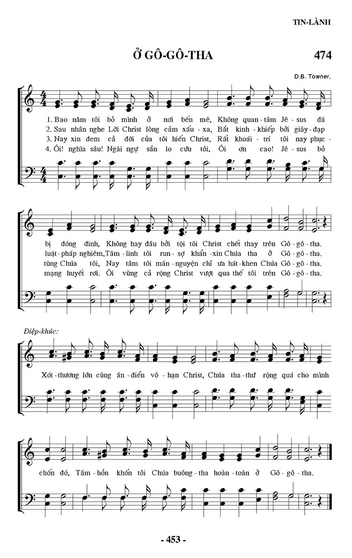 1. Bao năm tôi bỏ mình ở nơi bến mê, Không quan tâm Jê-sus đã bị đóng đinh, Không hay đâu bởi tội tôi Christ chết thay trên Gô-gô-tha. 2. Sau nhân nghe Lời Christ lòng cảm xấu xa, Bất kinh khiếp bởi giày - đạp luật - pháp nghiêm, Tâm - linh tôi run - sợ khẩn - xin Chúa tha ở Gô-gô - tha. 3. Nay xin đem cả đời của tôi hiến Christ, Rất khoái - trí tôi nay phục tùng Chúa tôi, Nay tâm tôi mãn nguyện chỉ ưa hát-khen Chúa Gô - gô - tha. 4. Ôi! nghĩa sâu! Ngài ngự sẵn lo cứu tôi, Ôi ơn cao! Jêsus bỏ mạng huyết rơi. Ôi vũng cả rộng Christ vượt qua thế tôi trên Gô - gô - tha. Điệp khúc: Xót - thương lớn cùng ân điển vô hạn Christ, Chúa tha thứ rộng quá cho mình chốn đó, Tâm - hồn khốn tôi Chúa buông - tha hoàn toàn ở Gô - gô - tha.