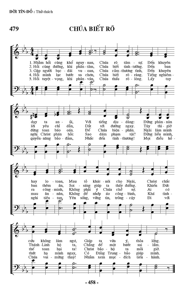 1. Nhằm hồi cùng khổ nguy - nan, Chúa rõ tâm sự. Đến khuyên day ta an ủi, Với tiếng dịu dàng: Đừng phân - nàn hay lo toan, Mau tổ khúc - nôi cho Ngài, Christ chắc cứu không làm ngơ, Giúp ta vừa ý, thỏa lòng. 2. Hồi cùng đường, khi phân - tâm, Chúa biết tinh - tường. Đến ban lời yêu chỉ dẫn, Dắt tới đường ngay. Tùy thì - giờ ban thêm ân, Soi sáng giúp ta thấy đường. Khiến Đức Thánh - Linh hộ ta, Chẳng để một bước sai lầm. 3. Gặp người bạc đãi vu oan, Chúa cảm - thương tình, Đến khuyên đừng toan báo oán. Để Chúa biện phân. Ngài làm mình ra công - minh, Không phải ý Chúa chơ sợ. Ai có thế toan hại ta! Christ bảo hộ ta mỗi giờ. 4. Hồi mình lạc bước sa chơn, Chúa biết rõ ràng. Tiếng nghiêm nghị Christ phán hỏi: Sao dám phạm tội? Đừng liều mình, mau ăn năn, Không để nhớp áo công - bình, Khá tình thức hạ mình ngay, Có Đấng Trung - bảo giúp mình. 5. Hồi tuyệt - vọng, khi phân - vân, Chúa thấu rõ lòng. Lấy tay quyền năng bảo đảm, Nhắc đến tình - thương! Mọi điều hồ - nghi tiêu tan, Yên sống, vững tin, trông - cậy Đi với Chúa vui mừng thay! Nhắm xem mục đích tiến hành,