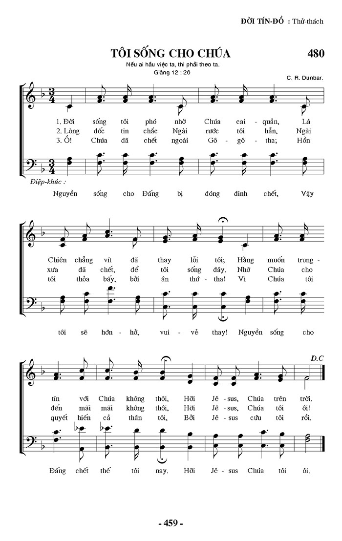 1. Đời sống tôi phó nhờ Chúa cai quản, Là tín với Chúa không thôi, Hỡi Jê-sus, Chúa trên trời. 2. Lòng dốc tin chắc Ngài rước tôi hẳn, Ngài đến mãi mãi không thôi, Hỡi Jê-sus, Chúa tôi ôi! 3. Ô! Chúa đã chết ngoài Gô-gô tha; Hồn quyết hiến cả thân tôi, Bởi Jê-sus cứu tôi rồi. Điệp khúc: Nguyền sống cho Đấng bị đóng đinh chết, Vậy tôi sẽ hơn-hở, vui-vẻ thay! Nguyền sống cho Đấng chết thế tôi nay. Hỡi Jê-sus Chúa tôi ôi. Chiên chẳng vít đã thay lỗi tôi; Hằng muốn trung-xưa đã chết, để tôi sống đây. Nhờ Chúa cho tôi thỏa bấy, bởi ân thứ-tha! Vì Chúa tôi
