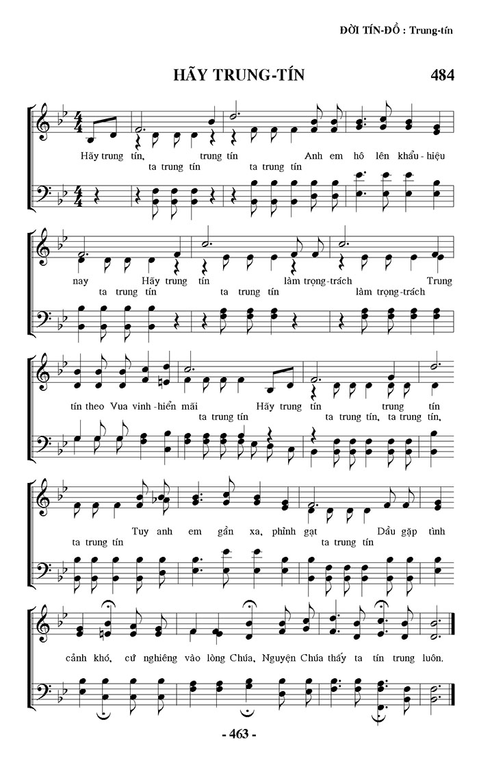 1. Hãy trung tín, trung tín Anh em hô lên khẩu - hiệu ta trung tín ta trung tín nay Hãy trung tín làm trọng trách Trung ta trung tín ta trung tín làm trọng trách tín theo Vua vinh-hiển mãi Hãy trung tín trung tín ta trung tín ta trung tín, ta trung tín Tuy anh em gần xa, phỉnh gạt Dầu gặp tình ta trung tín ta trung tín cảnh khó, cứ nghiêng vào lòng Chúa, Nguyện Chúa thấy ta tín trung luôn.