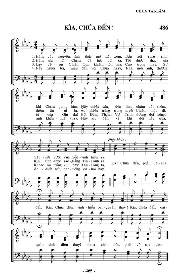 1. Hằng cầu nguyện, tỉnh thức mở mắt xem, Bầu trời rung rinh khi Christ giáng - lâm. Hãy chiếu sáng đèn linh, châm dầu thêm, vì khi đời nầy qua. 2. Hằng gìn lời Christ đã hứa với ta, Tội được tha, gia thêm ân tứ lạ. Áo phiếu trắng trong huyết Chiên, mặc đi, vì khi đời nầy qua. 3. Lạy Jê-sus, Chiên Con khiêm tốn kia, Cao trọng thay, Sư-tử của Giu-đa! Hỡi Đấng Thánh, Vợ Trình đương đợi trông, vì khi đời nầy qua. 4. Nầy người tội, mau đến với Chúa ngay, Ngài mời anh, thương thiết thay. Hãy kíp đến, vì khi đời nầy qua. Điệp khúc: Sắp sửa rước Vua hiển - vinh hiện ra. Kíp tỉnh - thức rao - giảng Tin - Lành ra. Khoác áo trắng vui rước Tân - Lang ta. Ân - điển hết, oan - uổng cơ - hội hay. Kìa! Chúa đến, phải Jê-sus đến, Kìa, Chúa đến, vinh - hiển oai - quyền thay! Kìa, Chúa đến, cai - quản vinh - diệu thay! Christ chắc đến, phải Jê-sus đến.