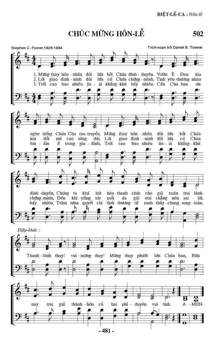 1. Mừng thay hôn - nhân đôi lứa bởi Chúa đính - duyên. Vườn Ê - Đen kia nghe tiếng Chúa Cha rao truyền. Mừng thay hôn - nhân đôi lứa bởi Chúa đính - duyên, Chúng ta khá hát hòa - thanh chúc cho gái xuân trai lành. 2. Lời giao đinh ninh đôi lứa có Chúa chứng - minh. Tình yêu - thương nhau kia đồi núi cao sông dài. Lời giao đinh - ninh đôi lứa có Chúa chứng minh, Đến khi trắng tóc mỗi da gái trai chẳng nên sai lời. 3. Trời cao bao nhiêu ân - ái khắng - khít bấy nhiêu. Cầu Cha ban ơn êm ấm ở trong gia đình, Trời cao bao nhiêu ân ái khắng khít bấy nhiêu, Trăm năm quyết chí tình thương tử sanh thủy - chung song - toàn. Điệp khúc: Thanh - bình thay! vui mừng thay! Mừng thay phước lớn Chúa ban, Bữa nay trai gái thành - hôn cả hai phỉ duyên vui tình. A - MEN.