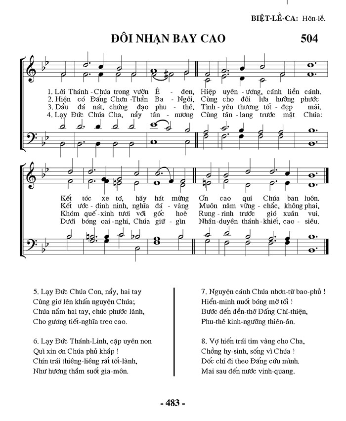 1. Lời Thánh - Chúa trong vườn Ê - đen, Hiệp uyên - ương, cánh liền cánh. Kết tóc xe tơ, hãy hát mừng Ơn cao quí Chúa ban luôn. 2. Hiện có Đấng Chơn Thần Ba - Ngôi, Cùng cho đôi lứa hưởng phước Kết ước - đinh ninh, nghĩa đá - vàng Muôn năm vững - chắc, không phai, 3. Dầu đá nát, chứng đạo phu - thê, Tình - yêu thương tốt - đẹp mãi. Khóm quế xinh tươi với gốc hoè Rung - rinh trước gió xuân vui. 4. Lạy Đức Chúa Cha, nầy tân - nương Cùng tân lang trước mặt Chúa: Dưới bóng oai-nghi, Chúa giữ - gìn Nhân-duyên thánh - khiết, cao - siêu. 5. Lạy Đức Chúa Con, nầy, hai tay Cùng giơ lên khấn nguyện Chúa; Chúa nắm hai tay, chúc phước lành, Cho gương tiết-nghĩa treo cao. 6. Lạy Đức Thánh-Linh, cặp uyên non Quì xin ơn Chúa phủ khắp ! Chín trái thiêng-liêng rất tốt lành, Như hương thắm suốt gia-môn. 7. Nguyện cánh Chúa nhơn-từ bao-phủ ! Hiển-minh nuốt bóng mờ tối ! Bước đến đền thờ Đấng Chí-thiện, Phu-thê kinh-ngưỡng thiên-ân. 8. Vợ hiến trái tim vàng cho Cha, Chồng hy-sinh, sống vì Chúa ! Dốc chí đi theo Đấng cứu mình. Mai sau đến nước vinh-quang.