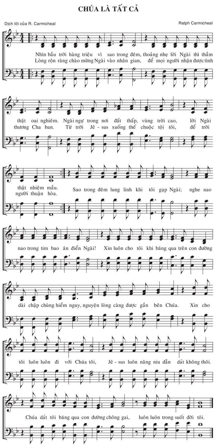 1. Nhìn bầu trời hàng triệu vì sao trong đêm, thoảng nhẹ lời Ngài thì thầm thật oai nghiêm. Ngài ngự trong nơi đất thấp, vùng trời cao, lời Ngài thương Cha ban. Từ trời Jê-sus xuống thế chuộc tội tôi, để trời thật nhiệm mầu. Sao trong đêm lung linh khi tôi gặp Ngài; nghe nao nao trong tim bao ân điển Ngài! Xin luôn cho tôi khi băng qua trên con đường dài chập chùng hiểm nguy, nguyện lòng càng được gần bên Chúa. Xin cho tôi luôn luôn đi với Chúa tôi, Jê-sus luôn nâng niu dẫn dắt không thôi. Chúa dắt tôi băng qua con đường chông gai, luôn luôn trong suốt đời tôi. 2. Nhìn bầu trời hàng triệu vì sao trong đêm, thoảng nhẹ lời Ngài thì thầm thật oai nghiêm. Ngài ngự trong nơi đất thấp, vùng trời cao, lời Ngài thương Cha ban. Từ trời Jê-sus xuống thế chuộc tội tôi, để trời thật nhiệm mầu. Sao trong đêm lung linh khi tôi gặp Ngài; nghe nao nao trong tim bao ân điển Ngài! Xin luôn cho tôi khi băng qua trên con đường dài chập chùng hiểm nguy, nguyện lòng càng được gần bên Chúa. Xin cho tôi luôn luôn đi với Chúa tôi, Jê-sus luôn nâng niu dẫn dắt không thôi. Chúa dắt tôi băng qua con đường chông gai, luôn luôn trong suốt đời tôi. 3. Lòng rộn ràng chào mừng Ngài vào nhân gian, để mọi người nhận được tình người thuận hòa. Sao trong đêm lung linh khi tôi gặp Ngài; nghe nao nao trong tim bao ân điển Ngài! Xin luôn cho tôi khi băng qua trên con đường dài chập chùng hiểm nguy, nguyện lòng càng được gần bên Chúa. Xin cho tôi luôn luôn đi với Chúa tôi, Jê-sus luôn nâng niu dẫn dắt không thôi. Chúa dắt tôi băng qua con đường chông gai, luôn luôn trong suốt đời tôi.