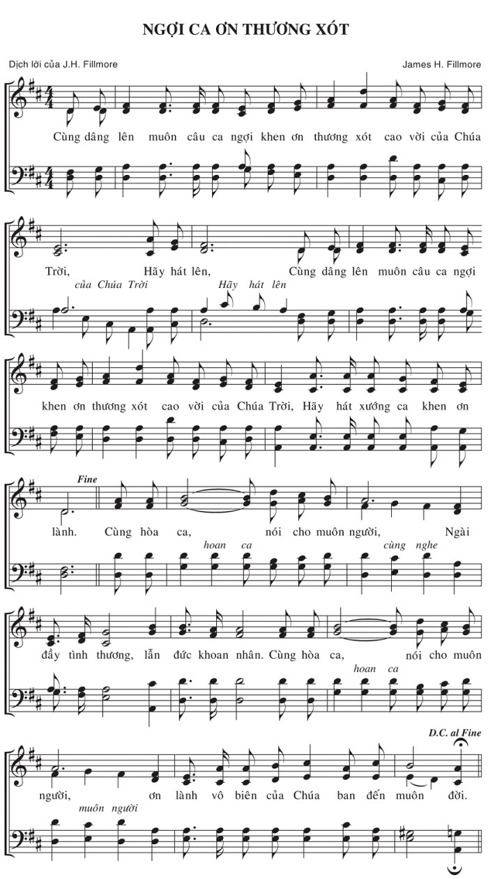 1. Cùng dâng lên muôn câu ca ngợi khen ơn thương xót cao vời của Chúa Trời, Hãy hát lên, Cùng dâng lên muôn câu ca ngợi của Chúa Trời Hãy hát lên khen ơn thương xót cao vời của Chúa Trời, Hãy hát xướng ca khen ơn lành. Cùng hòa ca, nói cho muôn người, cùng nghe Ngài đầy tình thương, lẫn đức khoan nhân. Cùng hòa ca, nói cho muôn người, ơn lành vô biên của Chúa ban đến muôn đời. 2. Cùng dâng lên muôn câu ca ngợi khen ơn thương xót cao vời của Chúa Trời, Hãy hát lên, Cùng dâng lên muôn câu ca ngợi của Chúa Trời Hãy hát lên khen ơn thương xót cao vời của Chúa Trời, Hãy hát xướng ca khen ơn lành. Cùng hòa ca, nói cho muôn người, cùng nghe Ngài đầy tình thương, lẫn đức khoan nhân. Cùng hòa ca, nói cho muôn người, ơn lành vô biên của Chúa ban đến muôn đời. 3. Cùng dâng lên muôn câu ca ngợi khen ơn thương xót cao vời của Chúa Trời, Hãy hát lên, Cùng dâng lên muôn câu ca ngợi của Chúa Trời Hãy hát lên khen ơn thương xót cao vời của Chúa Trời, Hãy hát xướng ca khen ơn lành. Cùng hòa ca, nói cho muôn người, cùng nghe Ngài đầy tình thương, lẫn đức khoan nhân. Cùng hòa ca, nói cho muôn người, ơn lành vô biên của Chúa ban đến muôn đời.