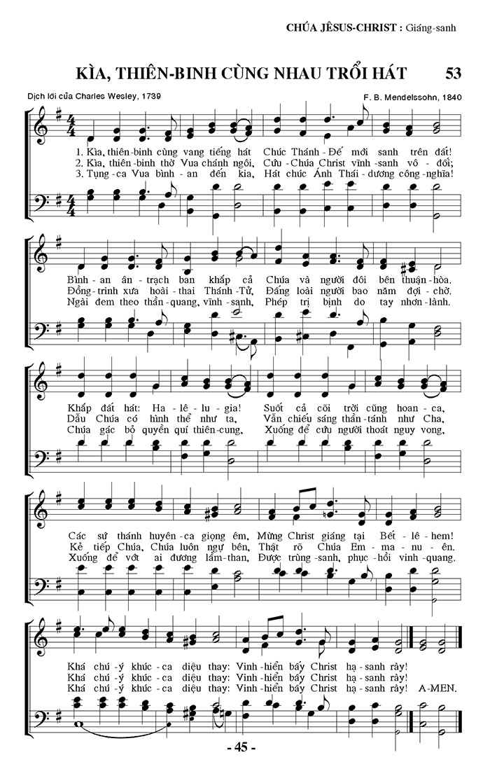 1. Kìa, thiên-binh cùng vang tiếng hát Chúc Thánh-Đế mới sanh trên đất! Bình-an ân trạch ban khắp cả Chúa và người đôi bên thuận-hòa. Khắp đất hát: Ha-lê-lu-gia! Suốt cả cõi trời cũng hoan-ca, Các sứ thánh huyên-ca giọng êm, Mừng Christ giáng tại Bết-lê-hem! 2. Kìa, thiên-binh thờ Vua chánh ngôi, Cứu-Chúa Christ vĩnh-sanh vô đối; Đồng-trinh xưa hoài-thai Thánh-Tử, Đấng loài người bao năm đợi-chờ. Dẫu Chúa có hình thể như ta, Vẫn chiếu sáng thần-tánh như Cha, Kẻ tiếp Chúa, Chúa luôn ngự bên, Thật rõ Chúa Em-ma-nu-ên. 3. Tụng-ca Vua bình-an đến kia, Hát chúc Ánh Thái-dương công-nghĩa! Ngài đem theo thần-quang, vĩnh-sanh, Phép trị bịnh do tay nhơn-lành. Chúa gác bỏ quyền quí thiên-cung, Xuống để cứu người thoát nguy vong, Xuống để vớt ai đương lầm-than, Được trùng-sanh, phục-hồi vinh-quang. Điệp khúc: Khá chú-ý khúc-ca diệu thay: Vinh-hiển bấy Christ hạ-sanh rày! Khá chú-ý khúc-ca diệu thay: Vinh-hiển bấy Christ hạ-sanh rày! Khá chú-ý khúc-ca diệu thay: Vinh-hiển bấy Christ hạ-sanh rày! A-MEN.