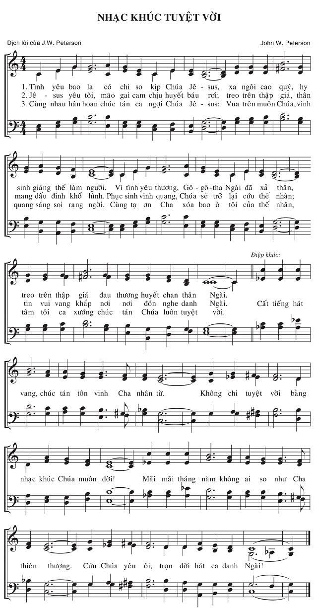 1. Tình yêu bao la có chi so kịp Chúa Jê-sus, xa ngôi cao quý, hy sinh giáng thế làm người. Vì tình yêu thương, Gô-gô-tha Ngài đã xả thân, treo trên thập giá đau thương huyết chan thân Ngài. 2. Jê-sus yêu tôi, mão gai cam chịu huyết báu rơi; treo trên thập giá, thân mang dấu định khổ hình. Phục sinh vinh quang, Chúa sẽ trở lại cứu thế nhân; tin vui vang khắp nơi nơi đón nghe danh Ngài. 3. Cùng nhau hân hoan chúc tán ca ngợi Chúa Jê-sus; Vua trên muôn Chúa, vinh quang sáng soi rạng ngời. Cùng tạ ơn Cha xóa bao ô tội của thế nhân, tâm tôi ca xướng chúc tán Chúa luôn tuyệt vời. Điệp khúc: Cất tiếng hát vang, chúc tán tôn vinh Cha nhân từ. Không chỉ tuyệt vời bằng nhạc khúc Chúa muôn đời! Mãi mãi tháng năm không ai so như Cha thiên thượng. Cứu Chúa yêu ôi, trọn đời hát ca danh Ngài!