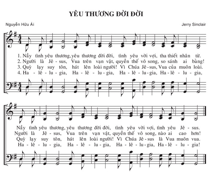 1. Nầy tình yêu thương, yêu thương đời đời, tình yêu vời vợi, tha thiết nhân từ. Nầy tình yêu thương, yêu thương đời đời, tình yêu vời vợi, tình yêu Jê-sus. 2. Người là Jê-sus, Vua trên vạn vật, quyền thế vô song, so sánh ai bằng! Người là Jê-sus, Vua trên vạn vật, quyền thế vô song, nào ai cao hơn! 3. Quỳ lạy suy tôn, hát lên loài người! Vì Chúa Jê-sus, Vua của muôn loài. Quỳ lạy suy tôn, hát lên loài người! Vì Chúa Jê-sus là Vua muôn vua. 4. Ha-lê-lu-gia, Ha-lê-lu-gia, Ha-lê-lu-gia, Ha-lê-lu-gia! Ha-lê-lu-gia, Ha-lê-lu-gia, Ha-lê-lu-gia, Ha-lê-lu-gia!
