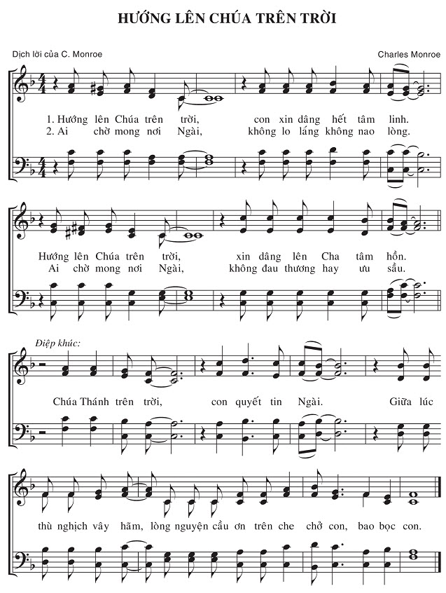 1. Hướng lên Chúa trên trời, con xin dâng hết tâm linh. Hướng lên Chúa trên trời, xin dâng lên Cha tâm hồn. 2. Ai chờ mong nơi Ngài, không lo lắng không nao lòng. Ai chờ mong nơi Ngài, không đau thương hay ưu sầu. Điệp khúc: Chúa Thánh trên trời, con quyết tin Ngài. Giữa lúc thù nghịch vây hãm, lòng nguyện cầu ơn trên che chở con, bao bọc con.