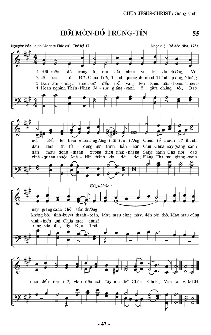 1. Hỡi môn đồ trung tín, dìu dắt nhau vui hát du dương, Vô nơi Bết-lê-hem chiêm ngưỡng thật tấn-tường, Chúa tể muôn sứ thánh nay giáng sanh chỗ tầm thường. Mau mau cùng nhau đến tôn thờ, Mau đến nơi đây tôn thờ Chúa Christ, Vua ta. A-MEN. 2. Jê-sus từ Đức Chúa Trời, Thánh-quang do chính Thánh-quang, Nhưng đâu khinh-thị tử cung nữ-trinh bần hàn; Cứu-Chúa nay giáng-sanh không bởi tinh-huyết thành-toàn. Mau mau cùng nhau đến tôn thờ, Mau đến nơi đây tôn thờ Chúa Christ, Vua ta. A-MEN. 3. Ban âm nhạc thiên sứ đều trổi vang lên khúc hân hoan, Thiên-dân mau đồng-thanh xướng điệu nhịp-nhàng: Sáng danh Cha nơi cao vinh-hiển qui Chúa mọi đàng! Mau mau cùng nhau đến tôn thờ, Mau đến nơi đây tôn thờ Chúa Christ, Vua ta. A-MEN. 4. Hoan nghinh Thần-Nhân Jê-sus giáng-sanh ở giữa chúng tôi, Bao vinh-quang thuộc Anh-Nhi thánh kia đời đời; Đấng Cha sai giáng-sanh trong xác-thịt, ấy Đạo Trời. Mau mau cùng nhau đến tôn thờ, Mau đến nơi đây tôn thờ Chúa Christ, Vua ta. A-MEN. Điệp khúc: nay giáng sanh chỗ tầm thường. không bởi tinh-huyết thành-toàn. Mau mau cùng nhau đến tôn thờ, Mau mau cùng vinh-hiển qui Chúa mọi đàng! trong xác-thịt, ấy Đạo Trời. nhau đến tôn thờ, Mau đến nơi đây tôn thờ Chúa Christ, Vua ta. A-MEN.