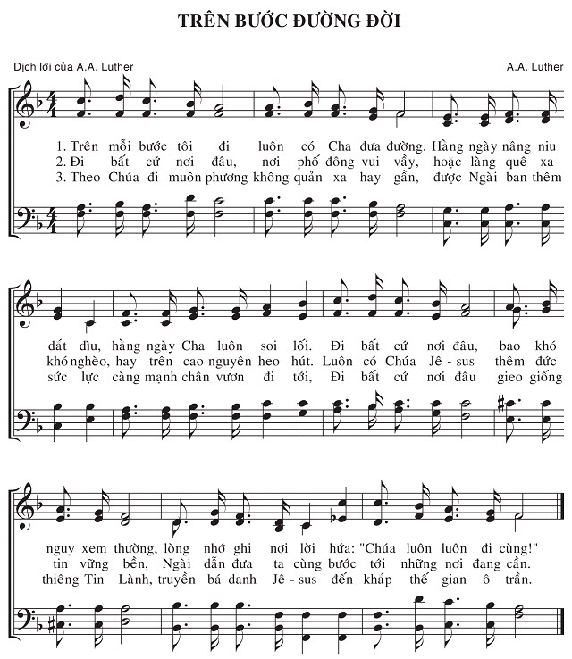 1. Trên mỗi bước tôi đi luôn có Cha đưa đường. Hàng ngày nâng niu dắt dìu, hàng ngày Cha luôn soi lối. Đi bất cứ nơi đâu, nguy xem thường, lòng nhớ ghi nơi lời hứa: "Chúa luôn luôn đi cùng!" 2. Đi bất cứ nơi đâu, nơi phố đông vui vầy, hoặc làng quê xa khó nghèo, hay trên cao nguyên heo hút. Luôn có Chúa Jê-sus thêm đức tin vững bền, Ngài dẫn đưa ta cùng bước tới những nơi đang cần. 3. Theo Chúa đi muôn phương không quản xa hay gần, được Ngài ban thêm sức lực càng mạnh chân vươn đi tới, Đi bất cứ nơi đâu gieo giống thiêng Tin Lành, truyền bá danh Jê-sus đến khắp thế gian ô trần.