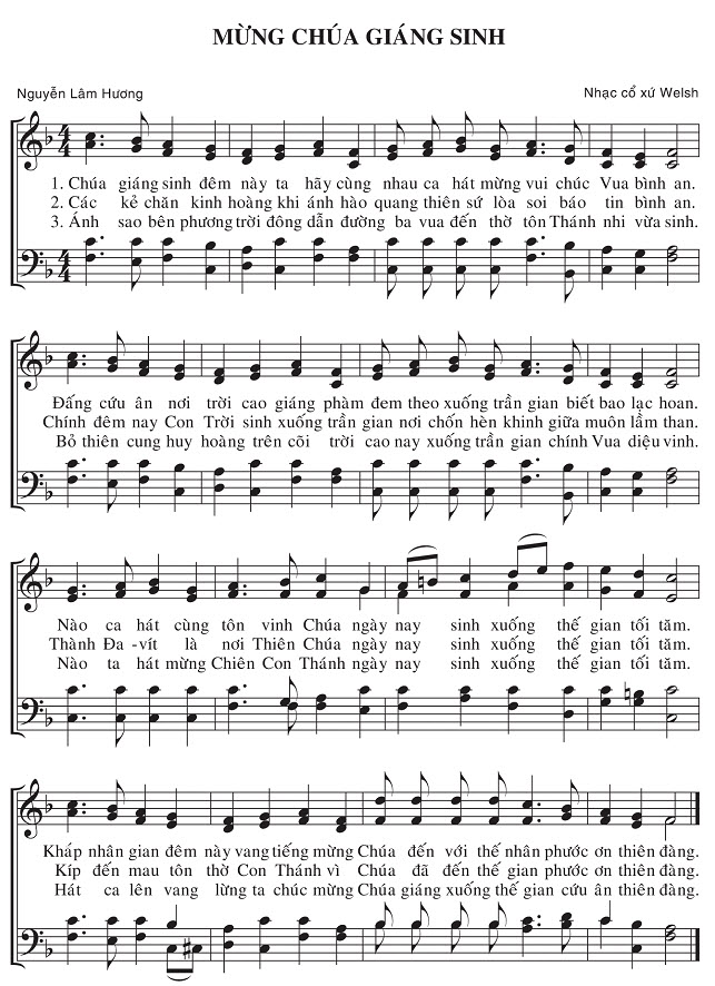 1. Chúa giáng sinh đêm này ta hãy cùng nhau ca hát mừng vui chúc Vua bình an. Đấng cứu ân nơi trời cao giáng phàm đem theo xuống trần gian biết bao lạc hoan. Nào ca hát cùng tôn vinh Chúa ngày nay sinh xuống thế gian tối tăm. Khắp nhân gian đêm này vang tiếng mừng Chúa đến với thế nhân phước ơn thiên đàng. 2. Các kẻ chăn kinh hoàng khi ánh hào quang thiên sứ lòa soi báo tin bình an. Chính đêm nay Con Trời sinh xuống trần gian nơi chốn hèn khinh giữa muôn lầm than. Thành Đa-vít là nơi Thiên Chúa ngày nay sinh xuống thế gian tối tăm. Kíp đến mau tôn thờ Con Thánh vì Chúa đã đến thế gian phước ơn thiên đàng. 3. Ánh sao bên phương trời đông dẫn đường ba vua đến thờ tôn Thánh nhi vừa sinh. Bỏ thiên cung huy hoàng trên cõi trời cao nay xuống trần gian chính Vua diệu vinh. Nào ta hát mừng Chiên Con Thánh ngày nay sinh xuống thế gian tối tăm. Hát ca lên vang lừng ta chúc mừng Chúa giáng xuống thế gian cứu ân thiên đàng.
