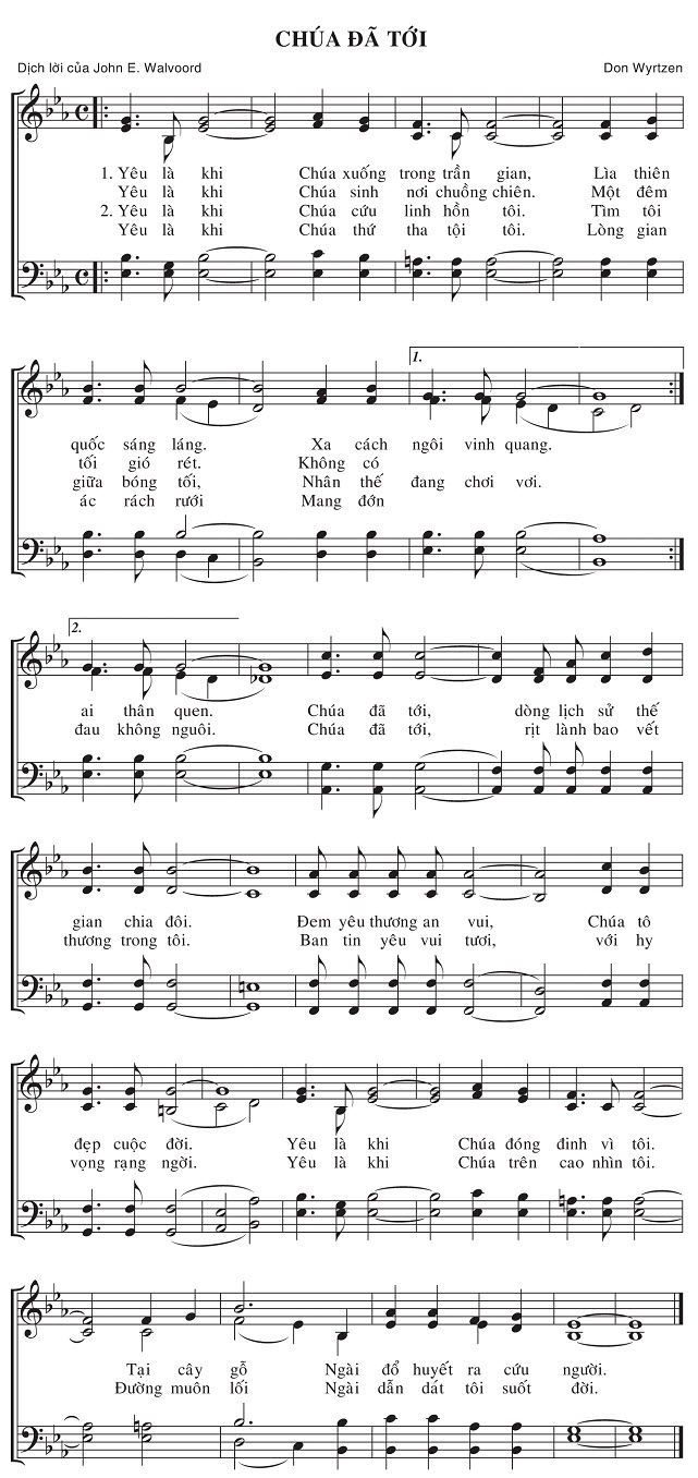 1. Yêu là khi Chúa xuống trong trần gian, Lìa thiên quốc sáng láng. Xa cách ngôi vinh quang. Yêu là khi Chúa sinh nơi chuồng chiên. Một đêm tối gió rét. Không có ai thân quen. Chúa đã tới, dòng lịch sử thế gian chia đôi. Đem yêu thương an vui, Chúa tô đẹp cuộc đời. Yêu là khi Chúa đóng đinh vì tôi. Tại cây gỗ Ngài đổ huyết ra cứu người. 2. Yêu là khi Chúa cứu linh hồn tôi. Tìm tôi giữa bóng tối, Nhân thế đang chơi vơi. Yêu là khi Chúa thứ tha tội tôi. Lòng gian ác rách rưới Mang đớn đau không nguôi. Chúa đã tới, rịt lành bao vết thương trong tôi. Ban tin yêu vui tươi, Chúa trên cao nhìn tôi. Đường muôn lối Ngài dẫn dắt tôi suốt đời. 3. Yêu là khi Chúa xuống trong trần gian, Lìa thiên quốc sáng láng. Xa cách ngôi vinh quang. Yêu là khi Chúa sinh nơi chuồng chiên. Một đêm tối gió rét. Không có ai thân quen. Chúa đã tới, dòng lịch sử thế gian chia đôi. Đem yêu thương an vui, Chúa tô đẹp cuộc đời. Yêu là khi Chúa đóng đinh vì tôi. Tại cây gỗ Ngài đổ huyết ra cứu người.