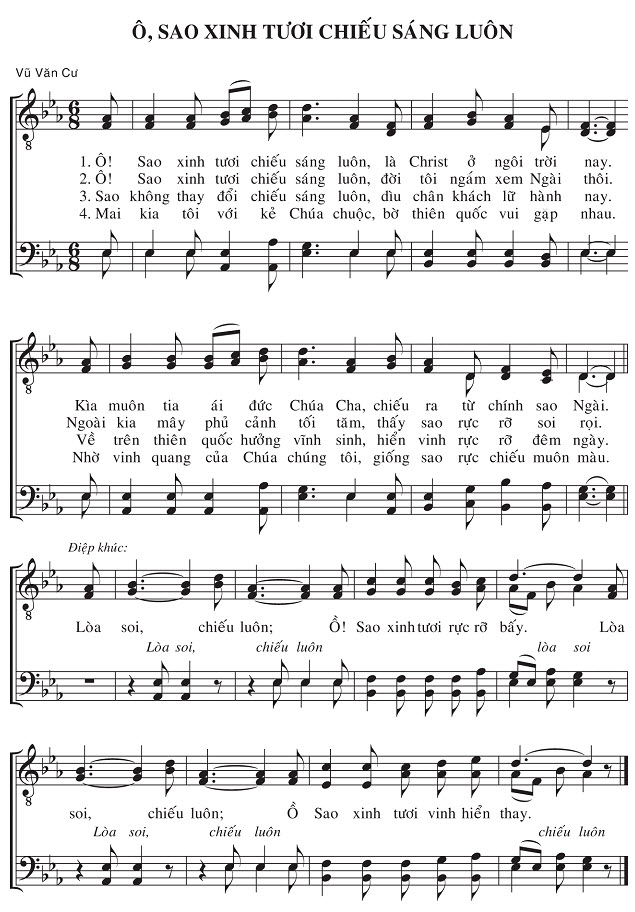 1. Ô! Sao xinh tươi chiếu sáng luôn, là Christ ở ngôi trời nay. Kìa muôn tia ái đức Chúa Cha, chiếu ra từ chính sao Ngài. 2. Ô! Sao xinh tươi chiếu sáng luôn, đời tôi ngắm xem Ngài thôi. Ngoài kia mây phủ cảnh tối tăm, thấy sao rực rỡ soi rọi. 3. Sao không thay đổi chiếu sáng luôn, dìu chân khách lữ hành nay. Về trên thiên quốc hưởng vĩnh sinh, hiển vinh rực rỡ đêm ngày. 4. Mai kia tôi với kẻ Chúa chuộc, bờ thiên quốc vui gặp nhau. Nhờ vinh quang của Chúa chúng tôi, giống sao rực chiếu muôn màu. Điệp khúc: Lòa soi, chiếu luôn; Ô! Sao xinh tươi rực rỡ bấy. Lòa soi, chiếu luôn; Ô Sao xinh tươi vinh hiển thay. Lòa soi, chiếu luôn; Lòa soi, chiếu luôn.
