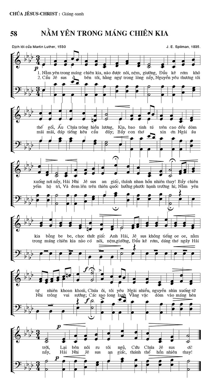 1. Nằm yên trong máng chiên kia, nào được nôi, nệm, giường, Đầu kê rơm khô thế gối, Ấu Chúa trông hiền lương, Kìa, bao tinh tú trên cao đều dòm xuống nơi nầy, Hài Nhi Jê sus an giấc, thánh nhan hồn nhiên thay! kia bỗng be be, chọc thức giấc Anh Hài, Jê sus không tiếng oe oe, nằm tư nhiên khoan khoái, Chúa ôi, tôi yêu Ngài nhiều, nguyễn nhìn xuống từ trời, Lại bên nôi ru tôi ngủ, Cứu Chúa Jê sus ơi! 2. Cầu Jê sus ở bên tôi, hằng ngự trong lòng nầy, Nguyễn yêu thương tôi mãi mãi, đáp tiếng kêu cầu đây; Bẩy con thơ xin ơn Ngài âu yếm hộ trì, Và đem lên trên thiên quốc hưởng phước hạnh trường hỉ; Nằm yên trong máng chiên kia nào có nôi, nệm giường, Đầu kê rơm, dáng thơ ngây Hài Nhi trông vui sướng; Các sao long lanh Vằng vặc dòm vào máng hèn nấy, Hài Nhi Jê sus an giấc, thánh thể hồn nhiên thay!