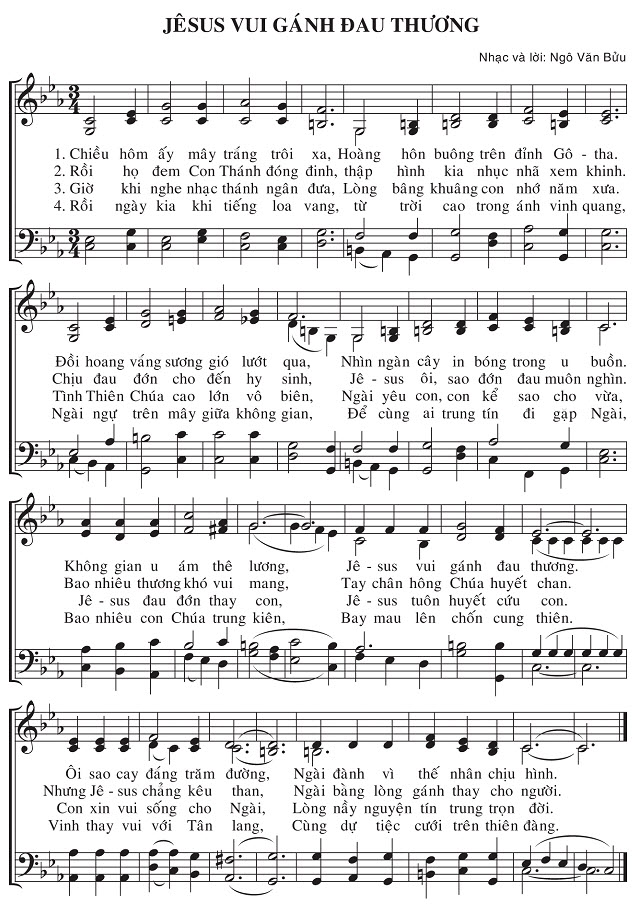 1. Chiều hôm ấy mây trắng trôi xa, Hoàng hôn buông trên đỉnh Gô - tha. Đồi hoang váng sương gió lướt qua, Nhìn ngàn cây in bóng trong u buồn. Không gian u ám thê lương, Jê-sus vui gánh đau thương. Ôi sao cay đắng trăm đường, Ngài đành vì thế nhân chịu hình. 2. Rồi họ đem Con Thánh đóng đinh, thập hình kia nhục nhã xem khinh. Chịu đau đớn cho đến hy sinh, Jê-sus ôi, sao đớn đau muôn nghìn. Bao nhiêu thương khó vui mang, Tay chân hông Chúa huyết chan. Nhưng Jê-sus chẳng kêu than, Ngài bằng lòng gánh thay cho người. 3. Giờ khi nghe nhạc thánh ngân đưa, Lòng bâng khuâng con nhớ năm xưa. Tình Thiên Chúa cao lớn vô biên, Ngài yêu con, con kể sao cho vừa. Jê-sus đau đớn thay con, Jê-sus tuôn huyết cứu con. Con xin vui sống cho Ngài, Lòng nầy nguyện tín trung trọn đời. 4. Rồi ngày kia khi tiếng loa vang, từ trời cao trong ánh vinh quang, Ngài ngự trên mây giữa không gian, Để cùng ai trung tín đi gặp Ngài, Bao nhiêu con Chúa trung kiên, Bay mau lên chốn cung thiên. Vinh thay vui với Tân lang, Cùng dự tiệc cưới trên thiên đàng.