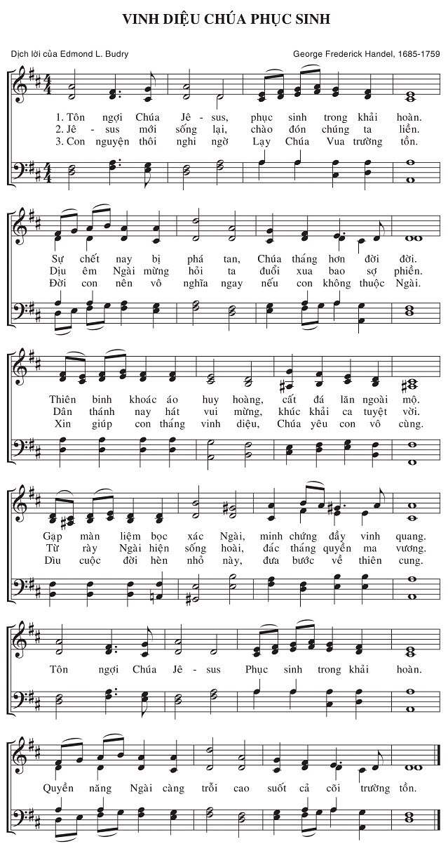 1. Tôn ngợi Chúa Jê-sus, phục sinh trong khải hoàn. Sự chết nay bị phá tan, Chúa thắng hơn đời đời. Thiên binh khoác áo huy hoàng, cất đá lăn ngoài mộ. Gặp màn liệm bọc xác Ngài, minh chứng đầy vinh quang. 2. Jê-sus mới sống lại, chào đón chúng ta liền. Dịu êm Ngài mừng hỏi ta đuổi xua bao sợ phiền. Dân thánh nay hát vui mừng, khúc khải ca tuyệt vời. Từ rày Ngài hiện sống hoài, đắc thắng quyền ma vương. 3. Con nguyện thôi nghi ngờ Lạy Chúa Vua trường tồn. Đời con nên vô nghĩa ngay nếu con không thuộc Ngài. Xin giúp con thắng vinh diệu, Chúa yêu con vô cùng. Dìu cuộc đời hèn nhỏ này, đưa bước về thiên cung. Điệp khúc: Tôn ngợi Chúa Jê-sus Phục sinh trong khải hoàn. Quyền năng Ngài càng trỗi cao suốt cả cõi trường tồn.