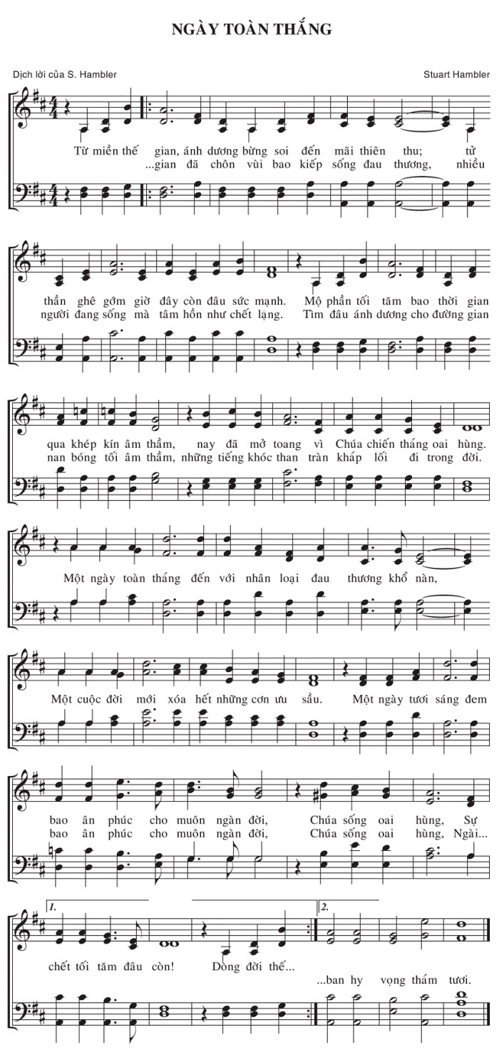 1. Từ miền thế gian, ánh dương bừng soi đến mãi thiên thu; thần ghê gớm giờ đây còn đâu sức mạnh. qua khép kín âm thầm, nay đã mở toang vì Chúa chiến thắng oai hùng. Một ngày toàn thắng đến với nhân loại đau thương khổ nàn, Một cuộc đời mới xóa hết những cơn ưu sầu. bao ân phúc cho muôn ngàn đời, Chúa sống oai hùng, Sự chết tối tăm đâu còn! 2. ...gian đã chôn vùi bao kiếp sống đau thương, tử nhiều người đang sống mà tâm hồn như chết lặng. Mộ phần tối tăm bao thời gian Tìm đâu ánh dương cho đường gian nan bóng tối âm thầm, những tiếng khóc than tràn khắp lối đi trong đời. Một ngày tươi sáng đem bao ân phúc cho muôn ngàn đời, Chúa sống oai hùng, Ngài... Dòng đời thế... ...ban hy vọng thắm tươi.