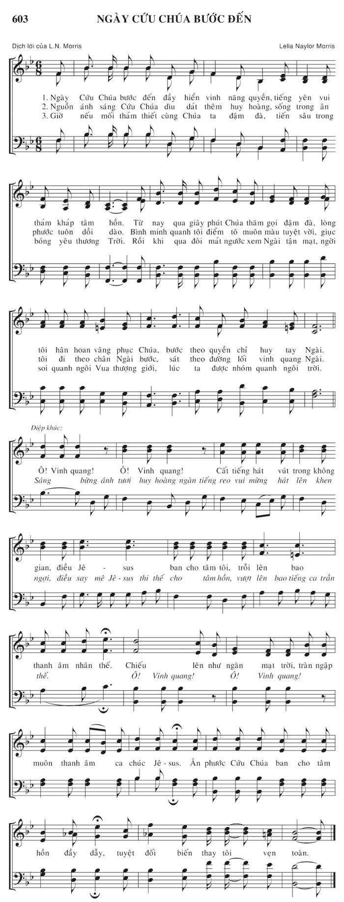 1. Ngày Cứu Chúa bước đến đầy hiển vinh năng quyền, tiếng yên vui thám kháp tâm hồn. Từ nay qua giây phút Chúa thăm gọi đậm đà, lòng tôi hân hoan vâng phục Chúa, bước theo quyền chỉ huy tay Ngài. 2. Nguồn ánh sáng Cứu Chúa dìu dát thêm huy hoàng, sống trong ân phước tuôn dồi dào. Bình minh quanh tôi điểm tô muôn màu tuyệt vời, giục tôi đi theo chân Ngài bước, sát theo đường lối vinh quang Ngài. 3. Giờ nếu mối thám thiết cùng Chúa ta đậm đà, tiến sâu trong bóng yêu thương Trời. Rồi khi qua đôi mát ngước xem Ngài tận mạt, ngời soi quanh ngôi Vua thượng giới, lúc ta được nhóm quanh ngôi trời. Điệp khúc: Ô! Vinh quang! Ô! Vinh quang! Cất tiếng hát vút trong không gian, điều Jê-sus ban cho tâm tôi, trỗi lên bao thanh âm nhân thế. Chiếu lên như ngàn mạt trời, tràn ngập thế. Ô! Vinh quang! Ô! Vinh quang! Sáng bừng ánh tươi huy hoàng ngàn tiếng reo vui mừng hát lên khen ngợi, điều say mê Jêsus thì thế cho tâm hồn, vượt lên bao tiếng ca trần muôn thanh âm ca chúc Jê-sus. Ân phước Cứu Chúa ban cho tâm hồn đầy dẫy, tuyệt đối biến thay tôi ven toàn.