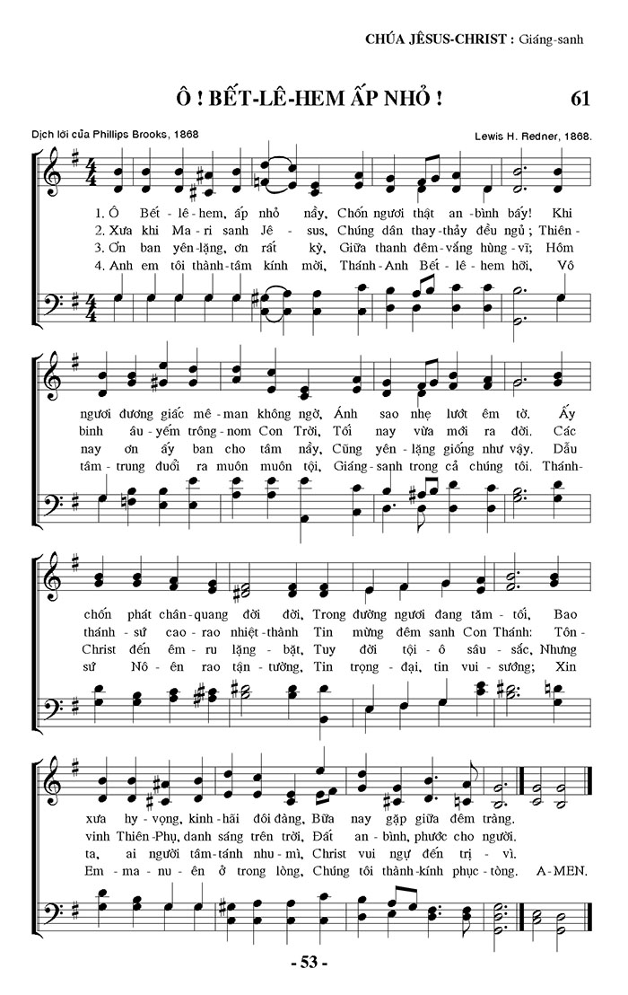 1. Ô Bết-lê-hem, ấp nhỏ nầy, Chốn ngươi thật an-bình bấy! Khi ngươi đương giấc mê-man không ngờ, Ánh sao nhẹ lướt êm tờ. Chốn phát chân-quang đời đời, Trong đường ngươi đang tăm tối, xưa hy vọng, kinh-hãi đôi đàng, Bữa nay gặp giữa đêm tràng. 2. Xưa khi Ma-ri sanh Jê-sus, Chúng dân thay thảy đều ngủ; Thiên-binh âu-yếm trông-nom Con Trời, Tối nay vừa mới ra đời. Thánh-sứ cao-rao nhiệt-thành Tin mừng đêm sanh Con Thánh: vinh Thiên-Phụ, danh sáng trên trời, Đất an-bình, phước cho người. 3. Ơn ban yên lặng, ơn rất kỳ, Giữa thanh đêm-vắng hùng-vĩ, Hôm nay ơn ấy ban cho tâm nầy, Cũng yên-lặng giống như vậy. Tôn-Christ đến êm-ru lặng bặt, Tuy đời tội-ô sâu-sắc, ta, ai người tâm tánh nhu-mì, Christ vui ngự đến trị-vì. 4. Anh em tôi thành tâm kính mời, Thánh-Anh Bết-lê-hem hỡi, Vô-tâm trung đuổi ra muôn muôn tội, Giáng-sanh trong cả chúng tôi. Thánh-sứ Nô-ên rao tận tường, Tin trọng-đại, tin vui-sướng; Xin Em-ma-nu-ên ở trong lòng, Chúng tôi thành-kính phục tông. A-MEN.