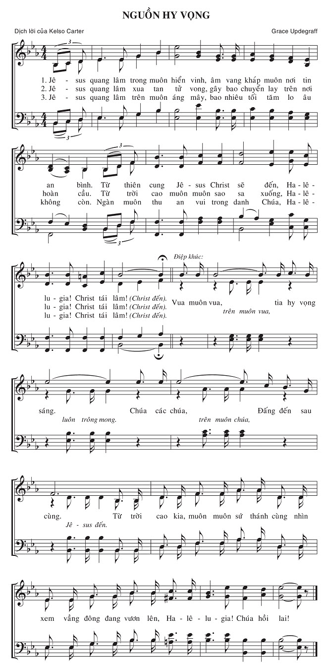 1. Jê-sus quang lâm trong muôn hiển vinh, âm vang khắp muôn nơi tin an bình. Từ thiên cung Jê-sus Christ sẽ đến, Ha-lê - 2. Jê-sus quang lâm xua tan tử vong, gây bao chuyển lay trên nơi hoàn cầu. Từ trời cao muôn muôn sao sa xuống, Ha-lê - 3. Jê-sus quang lâm trên muôn áng mây, bao nhiêu tối tăm lo âu không còn. Ngàn muôn thu an vui trong danh Chúa, Ha lê - 4. cùng. Jê-sus đến. Từ trời cao kia, muôn muôn sứ thánh cùng nhìn xem vẫng đông đang vươn lên, Ha lê lu - gia! Chúa hồi lai! Điệp khúc: lu-gia! Christ tái lâm! (Christ đến). Vua muôn vua, tia hy vọng trên muôn vua, sáng. Chúa các chúa, Đấng đến sau luôn trông mong. trên muôn chúa,