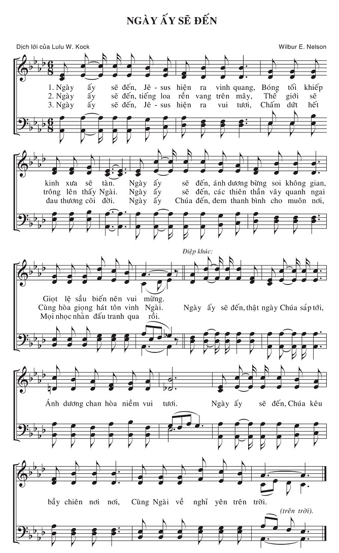 1. Ngày ấy sẽ đến, Jê-sus hiện ra vinh quang, Bóng tối khiếp kinh xưa sẽ tàn. Ngày ấy sẽ đến, ánh dương bừng soi không gian, 2. Ngày ấy sẽ đến, tiếng loa rền vang trên mây, Thế giới sẽ trông lên thấy Ngài. Ngày ấy sẽ đến, các thiên thần vây quanh ngai 3. Ngày ấy sẽ đến, Jê-sus hiện ra vui tươi, Chấm dứt hết đau thương cõi đời. Ngày ấy Chúa đến, đem thanh bình cho muôn nơi, Điệp khúc: Giọt lệ sầu biến nên vui mừng. Cùng hòa giọng hát tôn vinh Ngài. Mọi nhọc nhằn đấu tranh qua rồi. Ngày ấy sẽ đến, thật ngày Chúa sắp tới, Ánh dương chan hòa niềm vui tươi. Ngày ấy sẽ đến, Chúa kêu bầy chiên nơi nơi, Cùng Ngài về nghỉ yên trên trời. (trên trời).