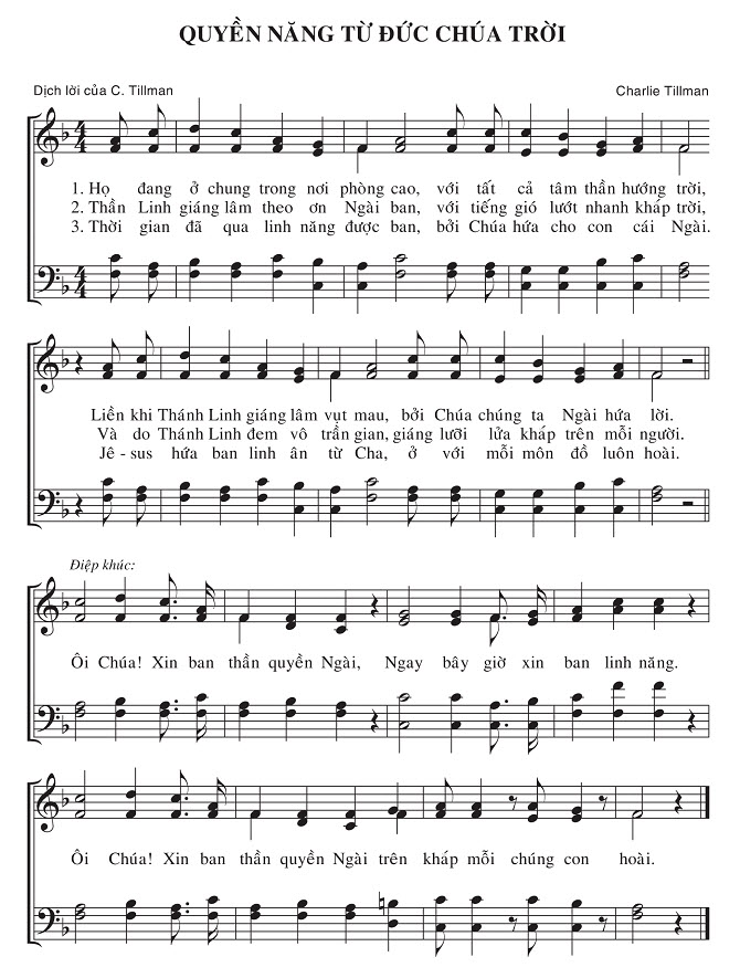 1. Họ đang ở chung trong nơi phòng cao, với tất cả tâm thần hướng trời, Liền khi Thánh Linh giáng lâm vụt mau, bởi Chúa chúng ta Ngài hứa lời. 2. Thần Linh giáng lâm theo ơn Ngài ban, với tiếng gió lướt nhanh khắp trời, Và do Thánh Linh đem vô trần gian, giáng lưỡi lửa khắp trên mỗi người. 3. Thời gian đã qua linh năng được ban, bởi Chúa hứa cho con cái Ngài. Jê-sus hứa ban linh ân từ Cha, ở với mỗi môn đồ luôn hoài. Điệp khúc: Ôi Chúa! Xin ban thần quyền Ngài, Ngay bây giờ xin ban linh năng. Ôi Chúa! Xin ban thần quyền Ngài trên khắp mỗi chúng con hoài.