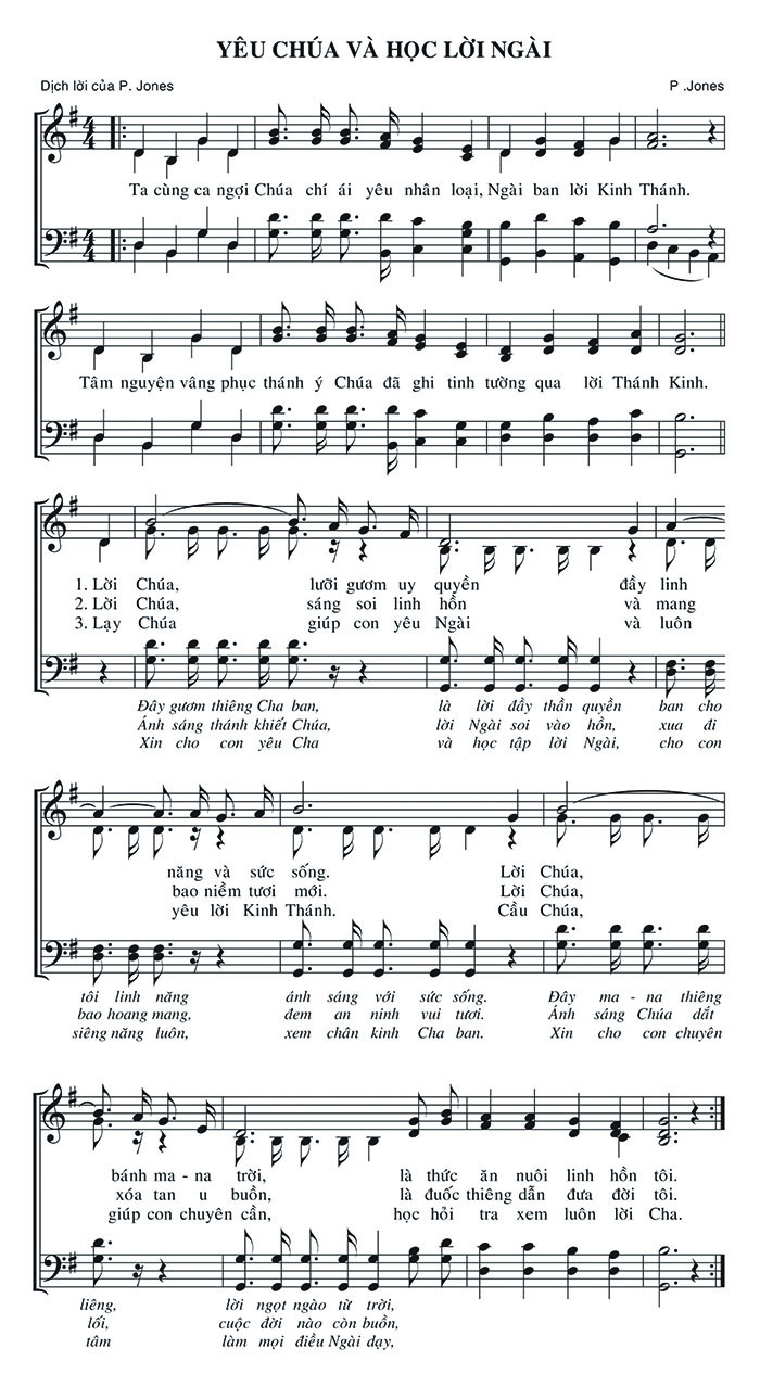 1. Lời Chúa, lưỡi gươm uy quyền đầy linh năng và sức sống. Đây gươm thiêng Cha ban, là lời đầy thần quyền ban cho tôi linh năng ánh sáng với sức sống. Bánh ma-na trời, là thức ăn nuôi linh hồn tôi. Lời ngọt ngào từ trời, liêng. 2. Lời Chúa, sáng soi linh hồn và mang bao niềm tươi mới. Ánh sáng thánh khiết Chúa, lời Ngài soi vào hồn, xua đi bao hoang mang, đem an ninh vui tươi. Xóa tan u buồn, là đuốc thiêng dẫn đưa đời tôi. Cuộc đời nào còn buồn, lối. 3. Lạy Chúa giúp con yêu Ngài và luôn yêu lời Kinh Thánh. Xin cho con yêu Cha và học tập lời Ngài, cho con siêng năng luôn, xem chân kinh Cha ban. Giúp con chuyên cần, học hỏi tra xem luôn lời Cha. Làm mọi điều Ngài dạy, tâm. Outro: Ta cùng ca ngợi Chúa chí ái yêu nhân loại, Ngài ban lời Kinh Thánh. Tâm nguyện vâng phục thánh ý Chúa đã ghi tinh tường qua lời Thánh Kinh. Đây ma-na thiêng Ánh sáng Chúa dắt Xin cho con chuyên
