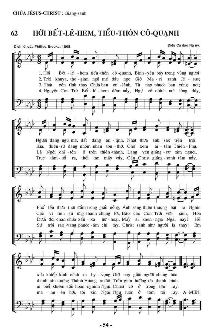 1. Hỡi Bết-lê-hem tiểu thôn cô quạnh, Bình yên bấy trong vùng ngươi! Người đang ngủ mê, đất đang an tịnh, Nhặt thưa ánh sao trên trời. Phố lều thưa thớt đắm trong giấc nồng, Ánh sáng thiên thượng bật ra, Nghìn xưa khiếp kinh cách xa hy vọng, Giờ nay giữa người chung hòa. 2. Trời khuya, thế gian ngủ mê đâu ngờ Giờ Ma-ri sanh Jê-sus; Kìa, thiên sứ đang nhóm nhau tôn thờ, Chờ xem ái-tâm Thiên-Phụ. Các vì tinh-tú ứng thanh chung lời, Báo cáo Con Trời vừa sinh, Hòa thanh tán dương Thánh Vương ra đời, Trần gian hưởng ơn thanh bình. 3. Thật yên tĩnh thay Chúa ban ơn lành, Từ nay phước ban cùng nơi; Là Ngôi chí-tôn ở trên thiên thành, Lặng yên giáng-cư tâm người. Dưới đời chan chứa xấu-xa hư-hoại, Mấy ai khen-ngợi Ngài nay? Hễ ai biết khiêm tốn hoan-nghinh Ngài, Christ vô ở trong tâm rày. 4. Nguyện Con Trẻ Bết-lê-hem đêm nầy, Ngự vô chính nơi lòng đây, Trục tăm-tối ra, thổi tan mây vầy, Cầu Christ giáng-sanh tâm nầy. Sứ trời rao-vang phước-âm chỉ tày, Christ sanh như người lạ thay! Em ma-nu-ên hỡi, tôi xin Ngài. Ngự luôn ở tâm tôi rày. A-MEN.