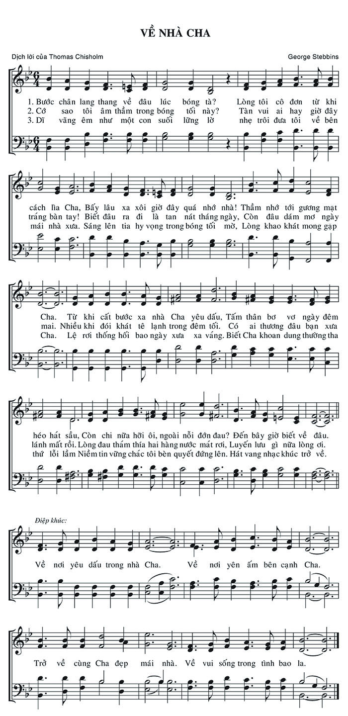 1. Bước chân lang thang về đâu lúc bóng tà? Lòng tôi cô đơn từ khi cách lìa Cha, Bấy lâu xa xôi giờ đây quá nhớ nhà! Thầm nhớ tới gương mặt Cha. Từ khi cất bước xa nhà Cha yêu dấu, Tấm thân bơ vơ ngày đêm héo hát sầu, Còn chi nữa hỡi ôi, ngoài nỗi đớn đau? Đến bây giờ biết về đâu. 2. Cớ sao tôi âm thầm trong bóng tối này? Tàn vui ai hay giờ đây tráng bàn tay! Biết đâu ra đi là tan nát tháng ngày, Còn đâu dám mơ ngày mai. Nhiều khi đói khát tê lạnh trong đêm tối. Có ai thương đâu bạn xưa lánh mất rồi. Lòng đau thám thía hai hàng nước mắt rơi, Luyến lưu gì nữa lòng ơi. 3. Dĩ vãng êm như một con suối lững lờ nhẹ trôi đưa tôi về bên mái nhà xưa. Sáng lên tia hy vọng trong bóng tối mờ, Lòng khao khát mong gặp Cha. Lệ rơi thống hối bao ngày xưa xa vắng. Biết Cha khoan dung thường tha thứ lỗi lầm Niềm tin vững chắc tôi bèn quyết đứng lên. Hát vang nhạc khúc trở về. chorus. Về nơi yêu dấu trong nhà Cha. Về nơi yên ấm bên cạnh Cha. Trở về cùng Cha đẹp mái nhà. Về vui sống trong tình bao la. Điệp khúc: Về nơi yêu dấu trong nhà Cha. Về nơi yên ấm bên cạnh Cha. Trở về cùng Cha đẹp mái nhà. Về vui sống trong tình bao la.