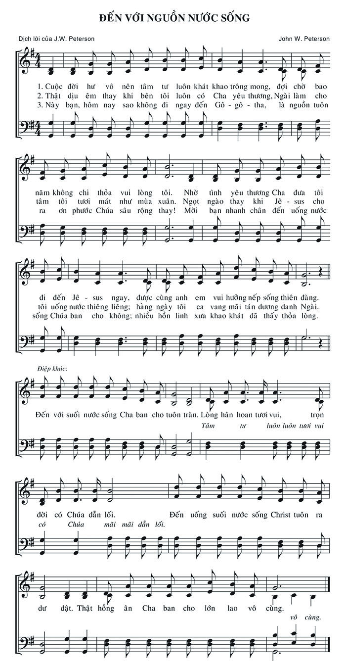 1. Cuộc đời hư vô nên tâm tư luôn khát khao trông mong, đợi chờ bao năm không chi thỏa vui lòng tôi. Nhờ tình yêu thương Cha đưa tôi đi đến Jê-sus ngay, được cùng anh em vui hưởng nếp sống thiên đàng. 2. Thật dịu êm thay khi bên tôi luôn có Cha yêu thương, Ngài làm cho tâm tôi tươi mát như mùa xuân. Ngọt ngào thay khi Jê-sus cho tôi uống nước thiêng liêng; hàng ngày tôi ca vang mãi tán dương danh Ngài. 3. Này bạn, hôm nay sao không đi ngay đến Gô-gô-tha, là nguồn tuôn ra ơn phước Chúa sâu rộng thay! Mời bạn nhanh chân đến uống nước sống Chúa ban cho không; nhiều hồn linh xưa khao khát đã thấy thỏa lòng. 4. Đến uống suối nước sống Christ tuôn ra dư dật. Thật hồng ân Cha ban cho lớn lao vô cùng. Điệp khúc: Đến với suối nước sống Cha ban cho tuôn tràn. Lòng hân hoan tươi vui, trọn Tâm tư luôn luôn tươi vui đời có Chúa dẫn lối. có Chúa mãi mãi dẫn lối.
