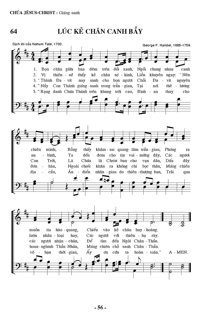 1. Bọn chăn giữa ban đêm trên đồi xanh, Ngồi chung nhau canh chiên mình; Bỗng thấy khâm-sai quang-lâm trần-gian, Phóng ra muôn tia hào-quang, Chiếu vào kẻ chăn huy-hoàng. 2. Vị thiên-sứ thấy kẻ chăn sợ-kinh, Liền khuyên ngay: "Nên an-bình, Ta đến đem cho tin vui-mừng đây, Các ngươi luôn nhân-loại hay, Các ngươi với thiên-hạ rày. 3. "Thành Đa-vít nay sanh cho bọn ngươi Chồi Đa-vít nguyên Con Trời, Là Chúa là Christ ban cho vạn dân, Dấu các ngươi nhận-chân, Để tìm đến Ngôi Chân-Thần. 4. "Nầy Con Thánh giáng-sanh trong trần-gian, Tại nơi thê lương đơn hàn, Ngoài chiếc khăn ra không chỉ bọc thân, Máng chiên chỗ sanh Chân-Thần, hoan-nghinh Thần-Nhân. 5. "Rạng danh Chúa Thánh trên khung trời cao, Bình-an thay cho địa-cầu, Ân điển nhân-gian do thiên-thượng ban, Trải qua vô-hạn thời-gian, Ấy ơn cứu ta hoàn-toàn." A-MEN.