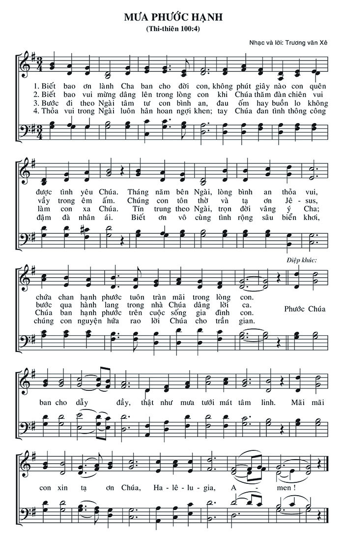 1. Biết bao ơn lành Cha ban cho đời con, không phút giây nào con quên được tình yêu Chúa. Tháng năm bên Ngài, lòng bình an thỏa vui, chứa chan hạnh phước tuôn tràn mãi trong lòng con. 2. Biết bao vui mừng dâng lên trong lòng con khi Chúa thăm đàn chiên vui vẫy trong êm ấm. Chúng con tôn thờ và tạ ơn Jê-sus, bước qua hành lang trong nhà Chúa dâng lời ca. 3. Bước đi theo Ngài tâm tư con bình an, đau ốm hay buồn lo không làm con xa Chúa. Tín trung theo Ngài, trọn đời vâng ý Cha; Chúa ban hạnh phước trên cuộc sống gia đình con. 4. Thỏa vui trong Ngài luôn hân hoan ngợi khen; tay Chúa đan tình thông công đậm đà nhân ái. Biết ơn vô cùng tình rộng sâu biển khơi, chúng con nguyện hứa rao lời Chúa cho trần gian. Điệp khúc: Phước Chúa ban cho dẫy đầy, thật như mưa tưới mát tâm linh. Mãi mãi con xin tạ ơn Chúa, Ha-lê-lu-gia, A-men!