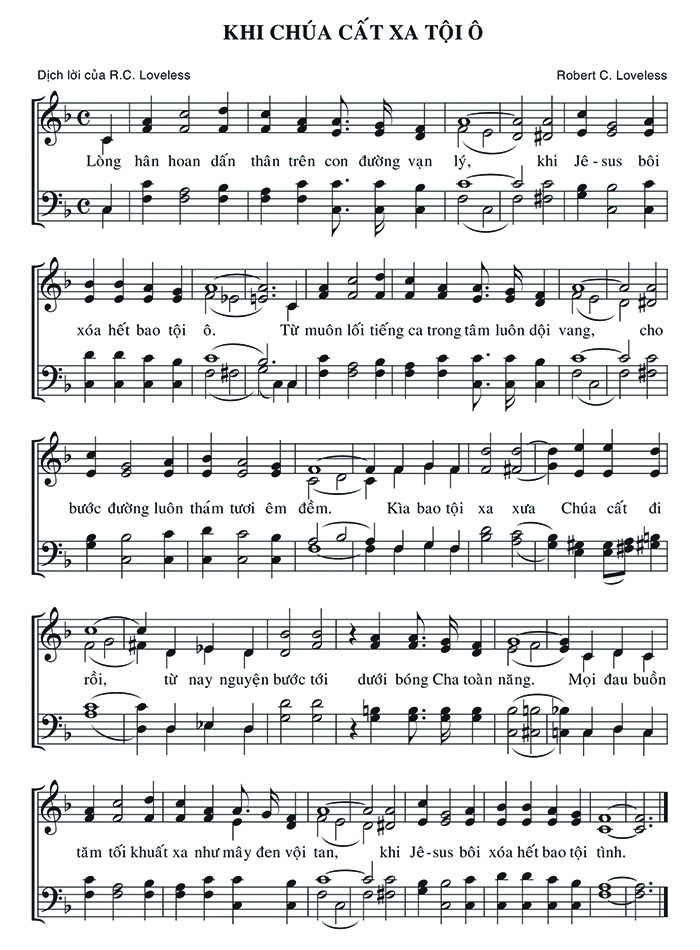 1. Lòng hân hoan dấn thân trên con đường vạn lý, khi Jêsus bôi xóa hết bao tội ô. Từ muôn lối tiếng ca trong tâm luôn dội vang, cho bước đường luôn thắm tươi êm đềm. Kìa bao tội xa xưa Chúa cất đi rồi, từ nay nguyện bước tới dưới bóng Cha toàn năng. Mọi đau buồn tăm tối khuất xa như mây đen vội tan, khi Jê-sus bôi xóa hết bao tội tình.