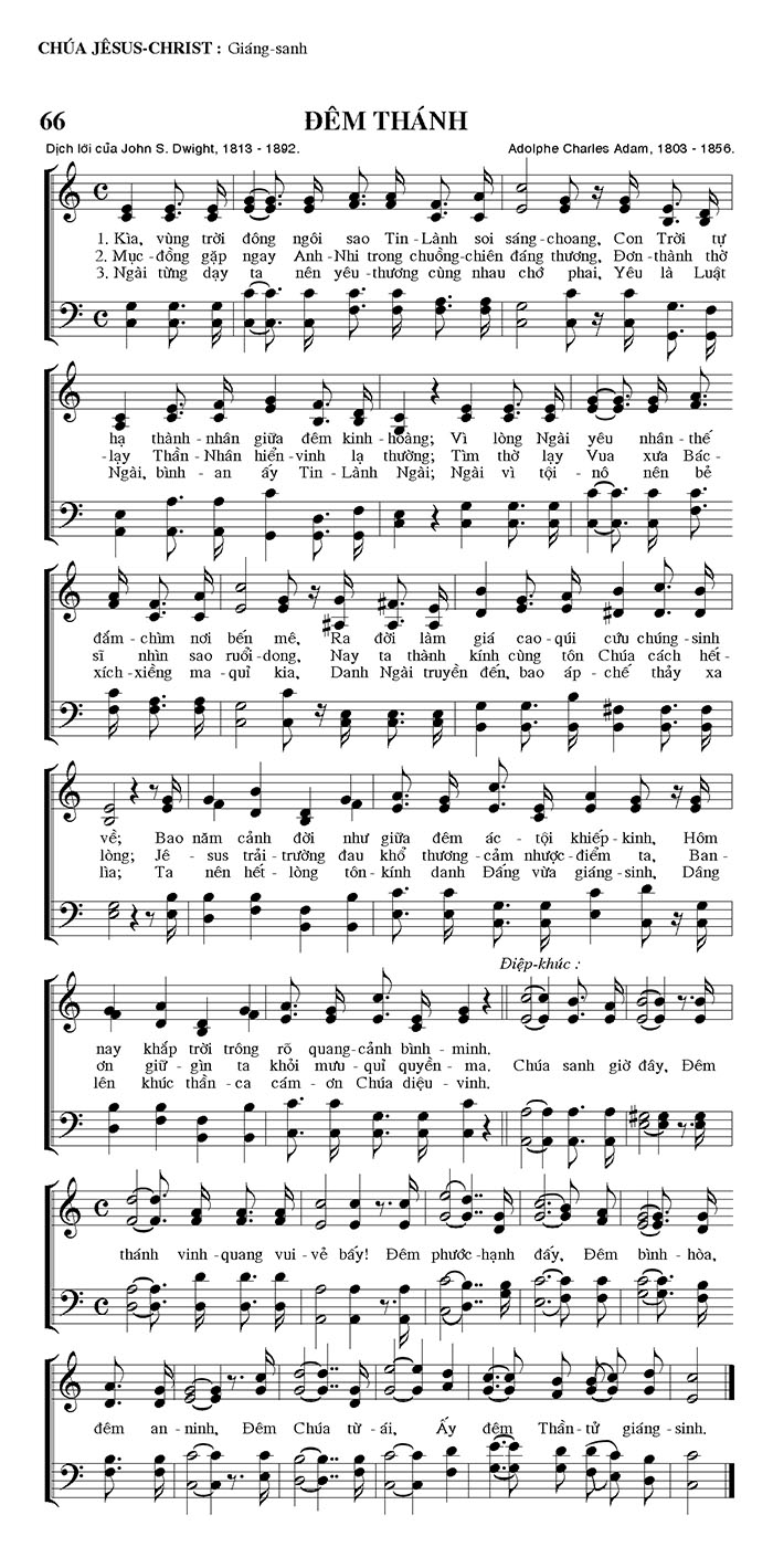 1. Kìa, vùng trời đông ngôi sao Tin Lành soi sáng choang, Con Trời tự hạ thánh - nhân giữa đêm kinh hoàng; Vì lòng Ngài yêu nhân - thế đấm - chìm nơi bến mê, Ra đời làm giá cao - qui cứu chúng - sinh về; Bao năm cảnh đời như giữa đêm ác tội khiếp - kinh, Hôm lòng; Jê sus trải - trường đau khổ thương - cảm nhược - điểm ta, Ban lìa; Ta nên hết lòng tôn - kính danh Đấng vừa giáng - sinh, Dâng nay khắp trời trông rõ quang - cảnh bình minh. 2. Mục - đồng gặp ngay Anh - Nhi trong chuồng - chiên đáng thương, Đơn - thành thờ - lạy Thần - Nhân hiển - vinh lạ thường; Tìm thờ lạy Vua xưa Bác sĩ nhìn sao ruổi - dong, Nay ta thành kính cùng tôn Chúa cách hết - ơn giữ gìn ta khỏi mưu - quỉ quyền - ma. 3. Ngài từng dạy ta nên yêu - thương cùng nhau chớ phai, Yêu là Luật Ngài, bình an ấy Tin - Lành Ngài; Ngài vì tội - nô nên bẻ xích - xiềng ma - quỉ kia, Danh Ngài truyền đến, bao áp chế thảy xa lên khúc thần ca cám ơn Chúa diệu vinh. Điệp khúc: Chúa sanh giờ đây, Đêm thánh vinh - quang vui - vẻ bấy! Đêm phước - hạnh đấy, Đêm bình - hòa, đêm an ninh, Đêm Chúa từ - ái, Ấy đêm Thần - tử giáng - sinh.